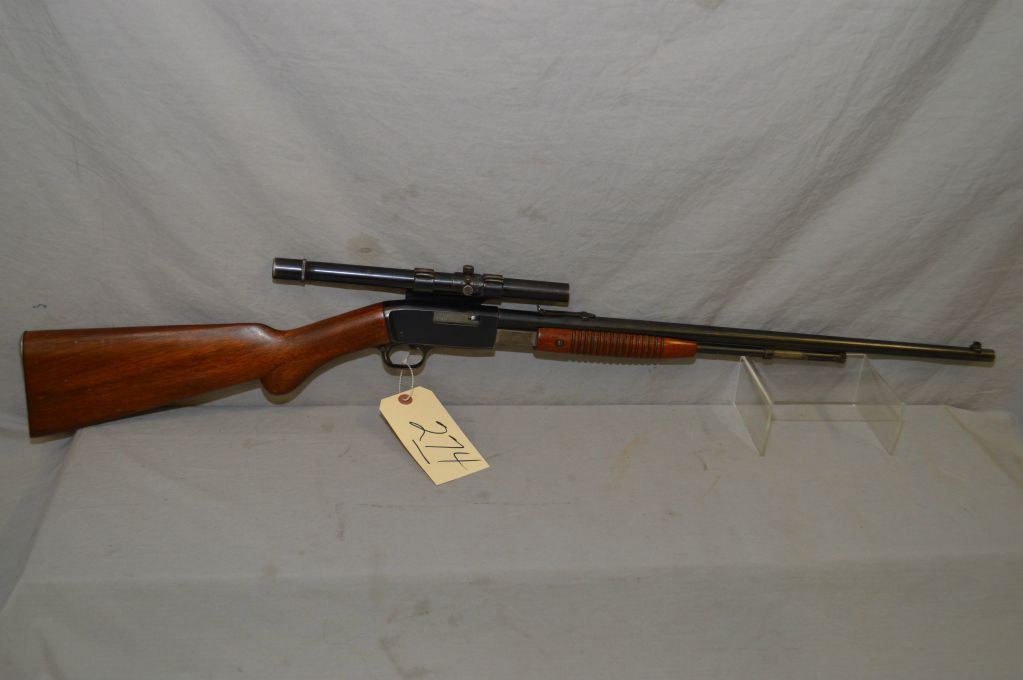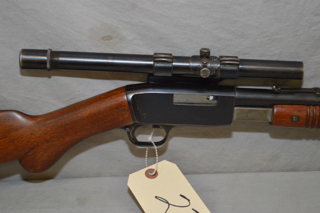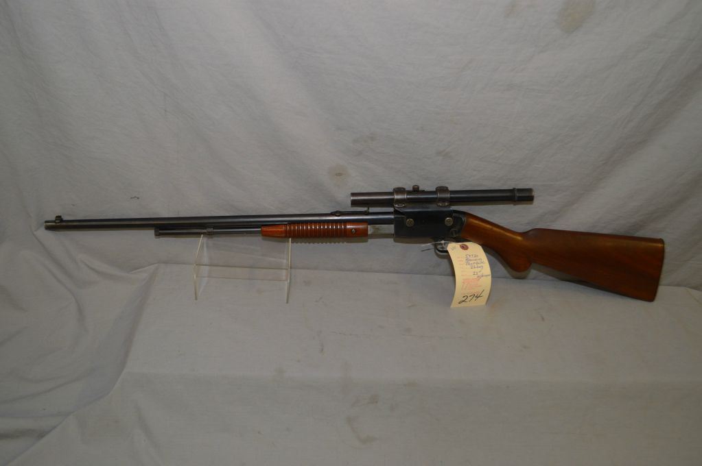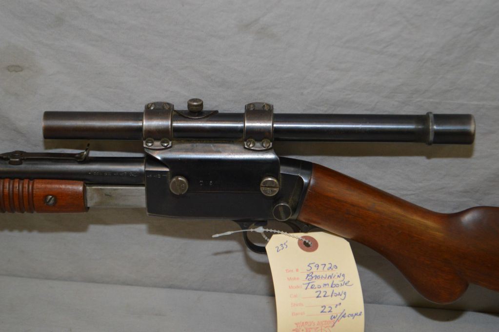 F.N. Browning Model Trombone .22 Long Cal Tube Fed Pump Action Rifle w/22" bbl [ good blued finish, starting to fade in carry areas, barrel sights, missing the lift, also has Weaver Mod 333 Scope in receiver side mounted base with rings, good wood with rounded pistol grip butt stock with metal butt plate, good forewood ] Ser # 59720