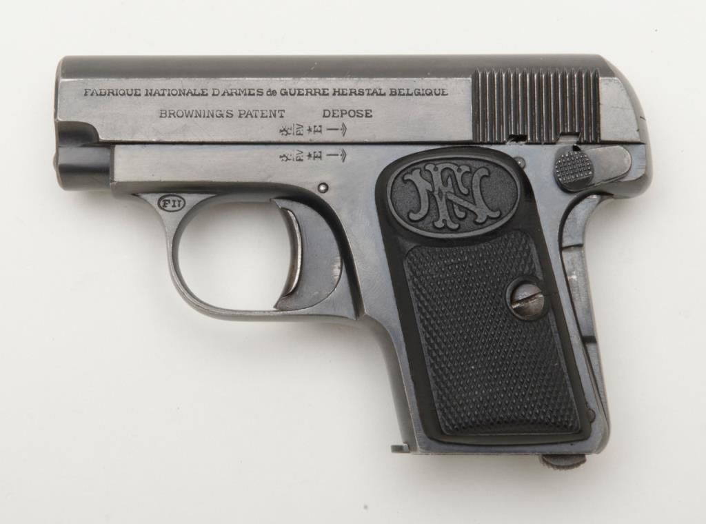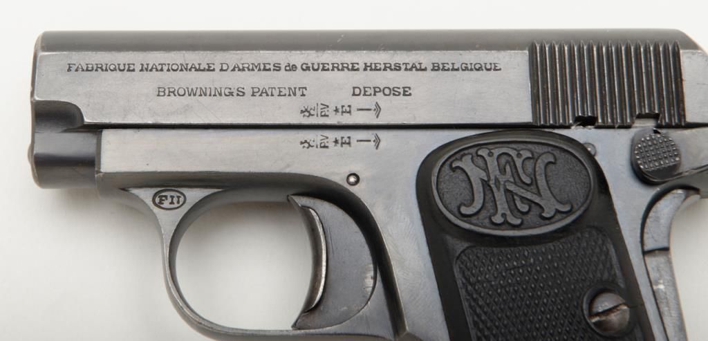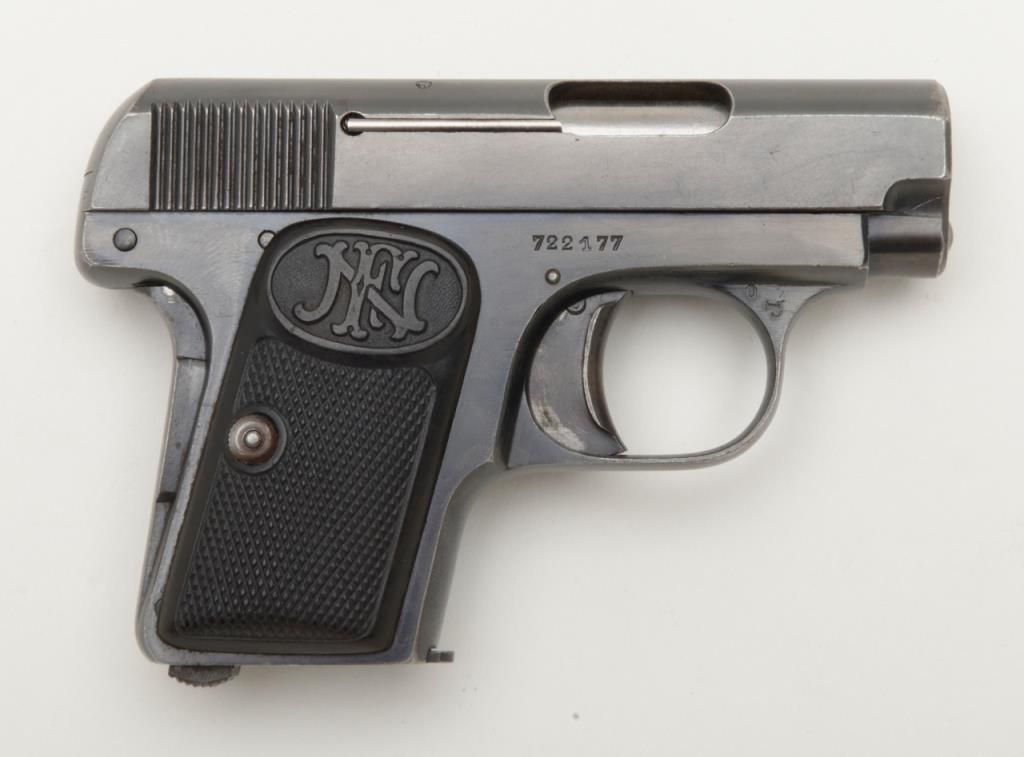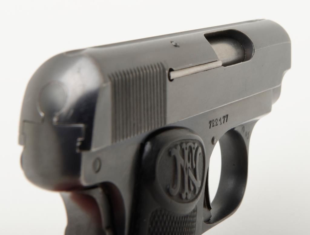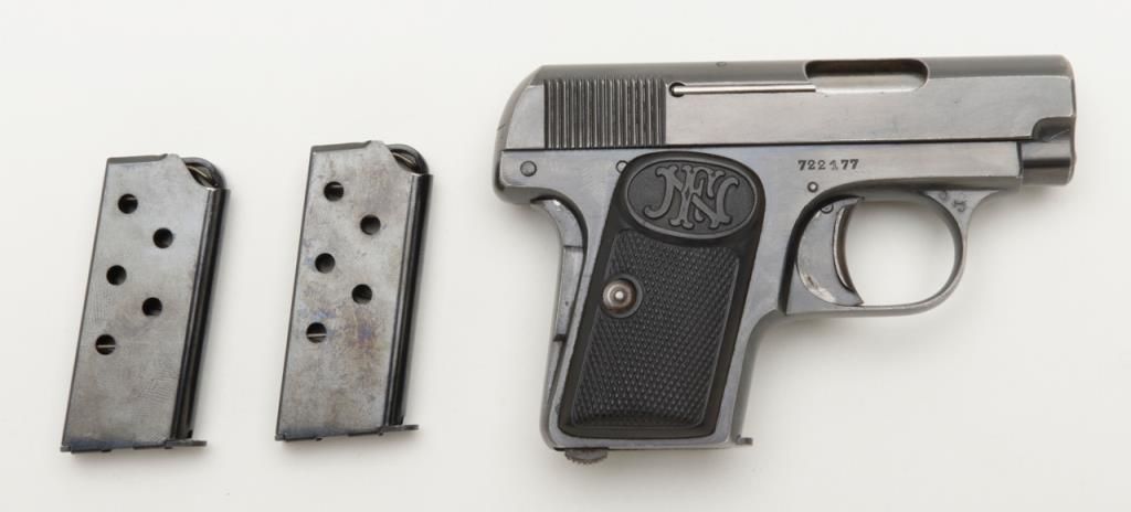 F.N. Browning patent Model 1908, .25 ACP caliber semiautomatic pistol in very good plus to near fine used condition, serial number 722177. The pistol shows 90% to 95% original blue with thinning at the edges and just normal aging and wear. The grips are also good to very good. 3 clips are included. Est.: $150-$300