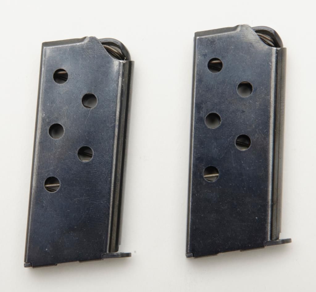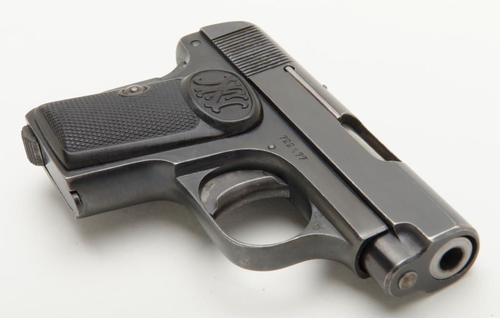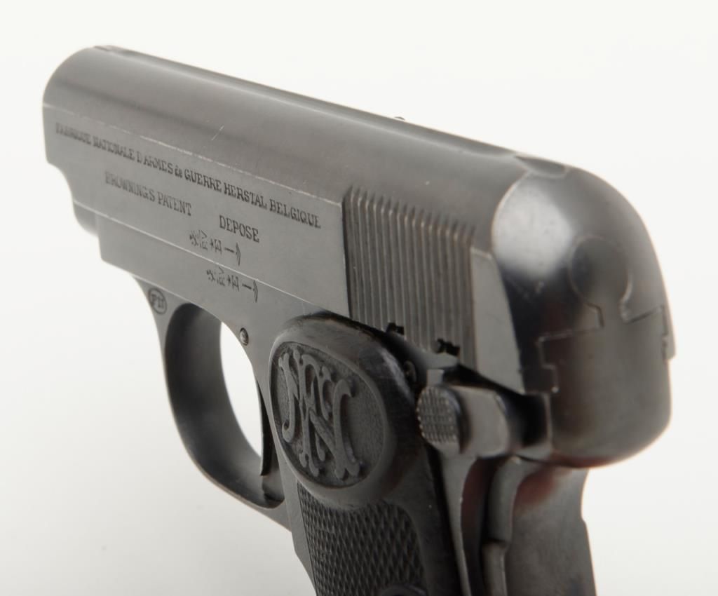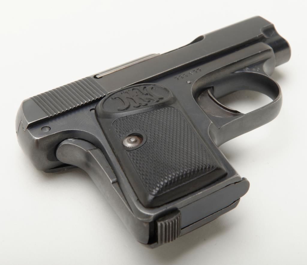 F.N. Browning patent Model 1908, .25 ACP caliber semiautomatic pistol in very good plus to near fine used condition, serial number 722177. The pistol shows 90% to 95% original blue with thinning at the edges and just normal aging and wear. The grips are also good to very good. 3 clips are included. Est.: $150-$300