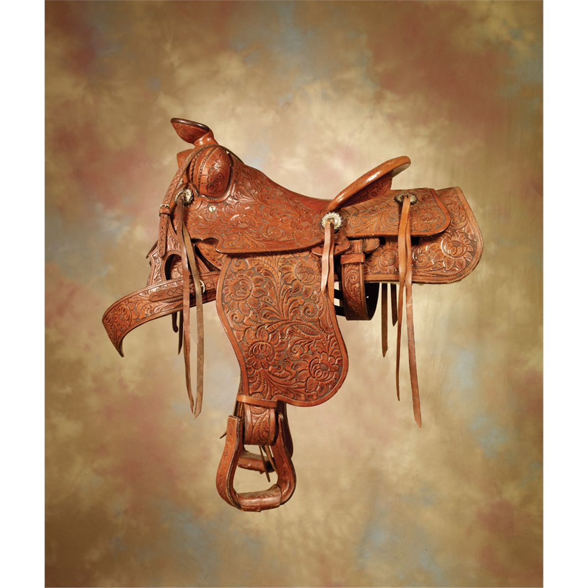 15” seat, nice, floral carving, Cheyenne roll and 3” swells. Round skirts, six slotted 1 3/4” sterling conchos. Includes matching breast collar