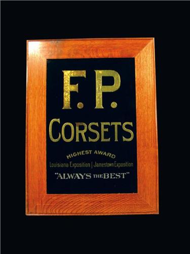 F.P. Corsets Reverse Glass Sign, in period oak frame. Excellent condition. 17 X 23 inches overall.
