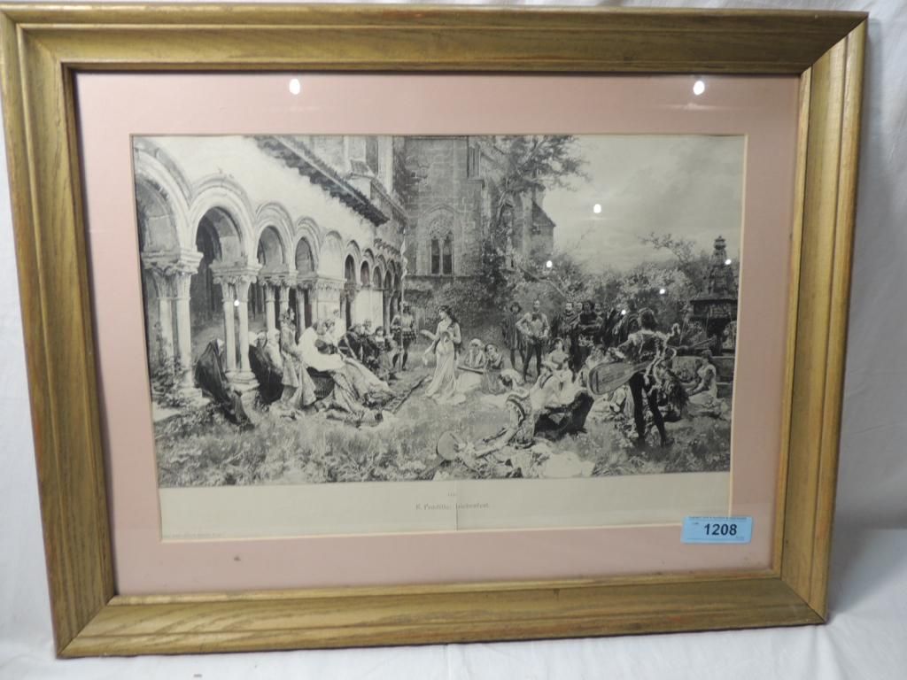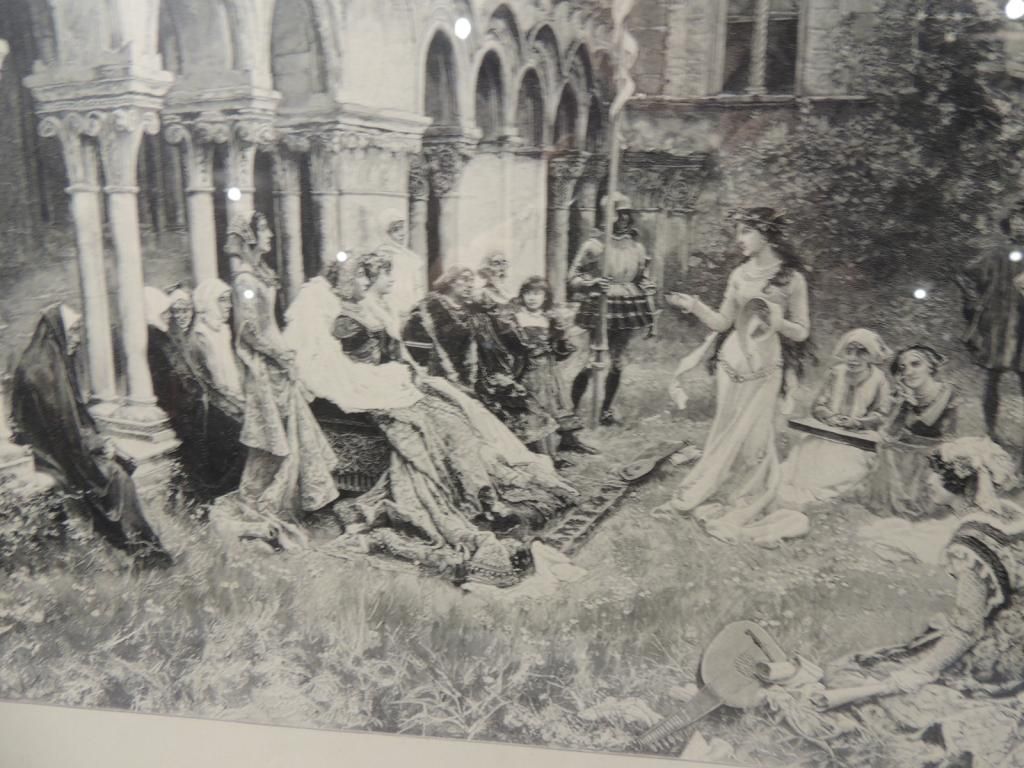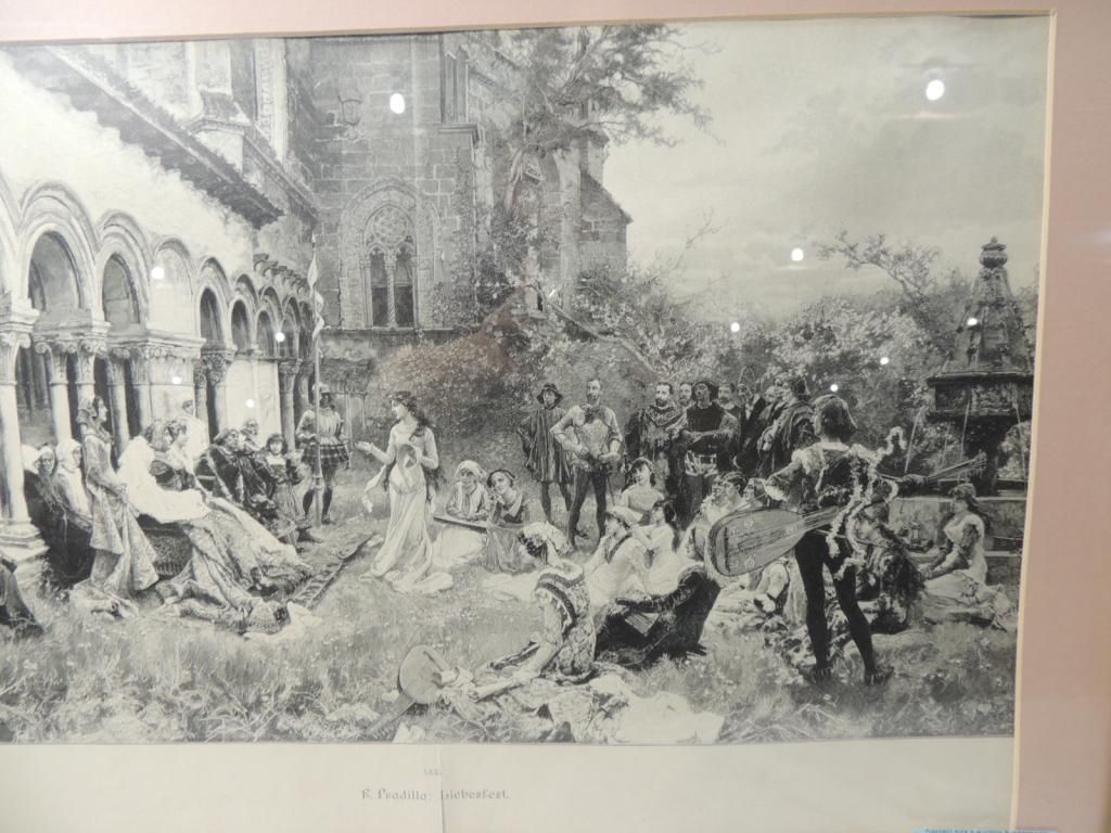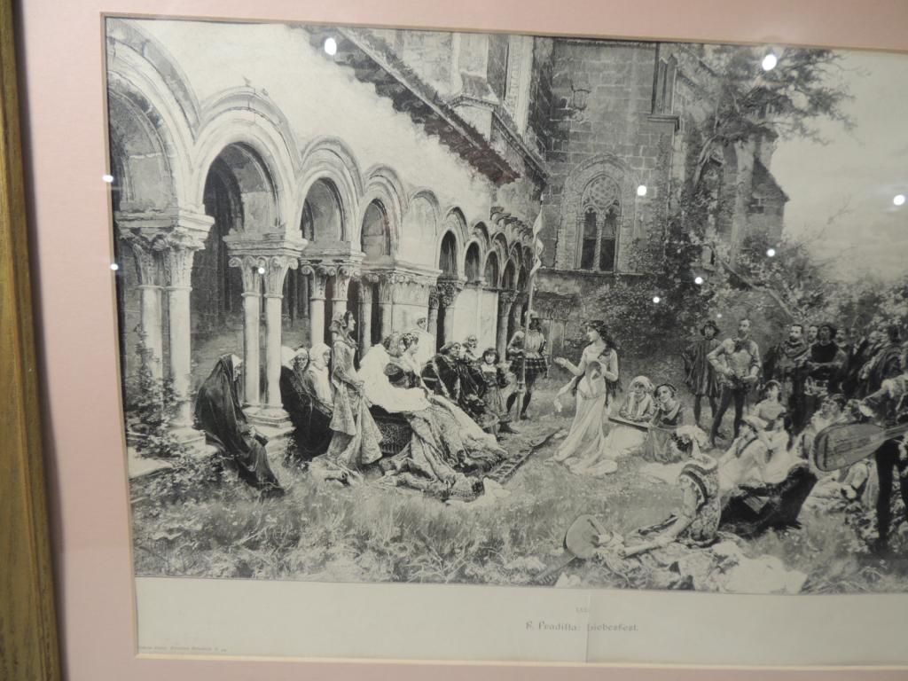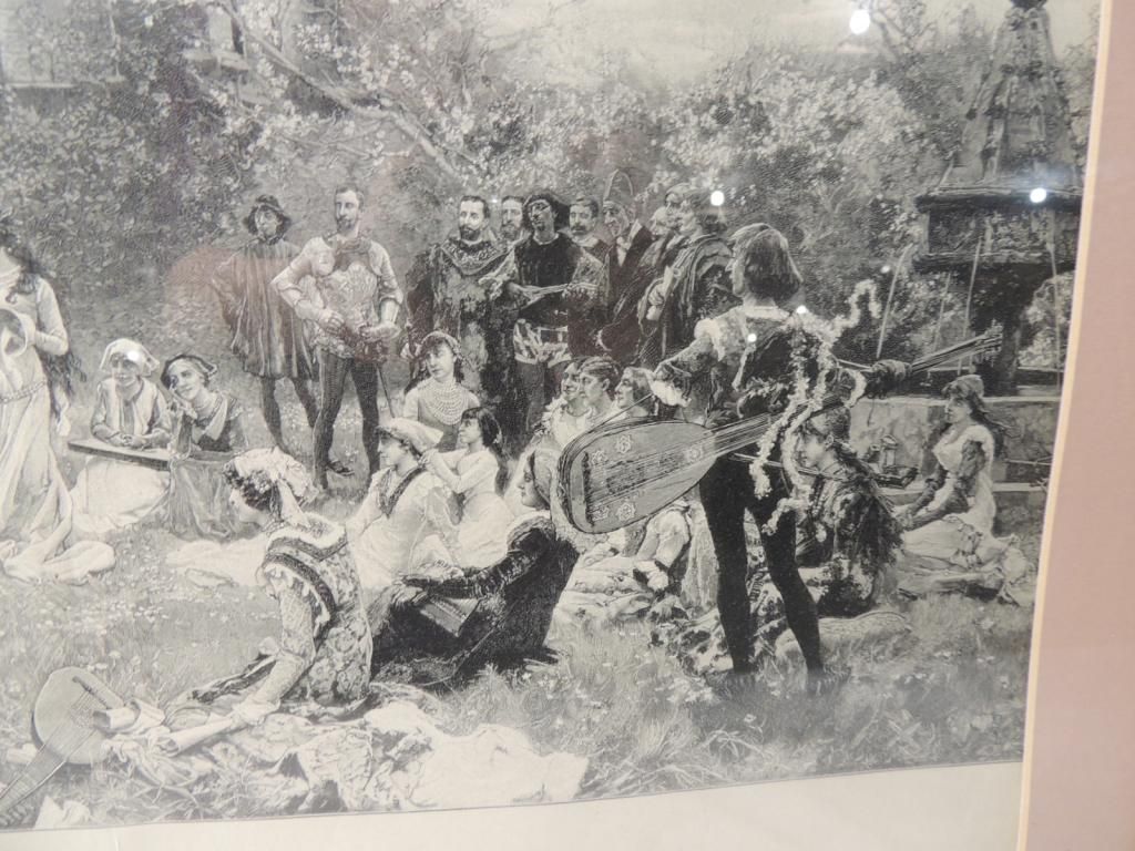 F. PRADILLA LIEBESFEST BLACK AND WHITE INK DRAWING PRINT. MATTED AND FRAMED. RENESANCE DRAWING. 21 X 27" WOODEN FRAME MATTED. AS SHOWN. SEE PHOTO FOR MORE DETAILS