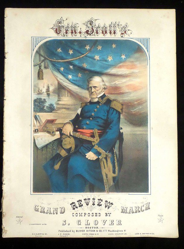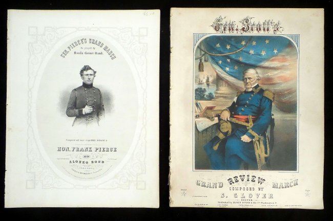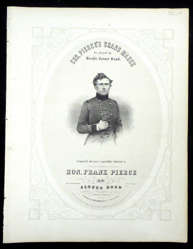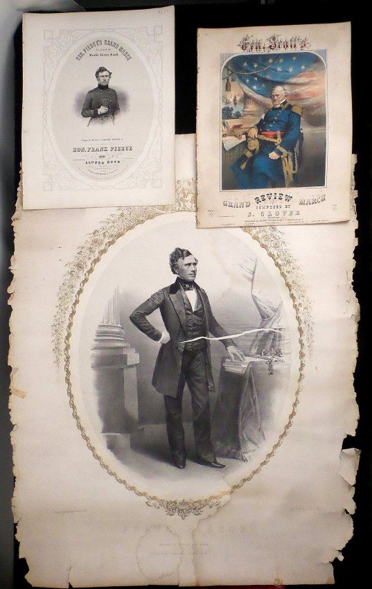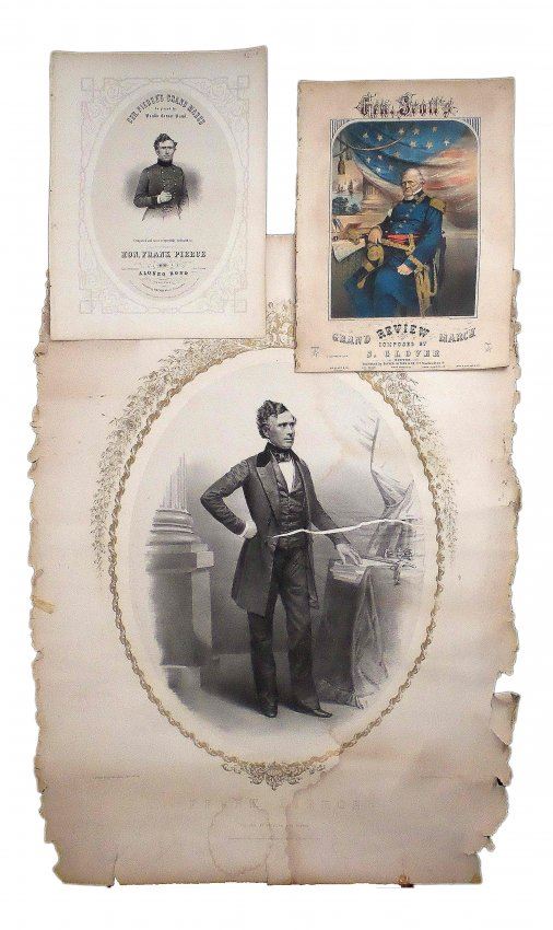 Two large 4to sheet music compositions comprising of 1.) "Gen. Pierce's Grand March / as played by / Bonds Cornet Band...", published by "Geo. P. Reed & Co...". 2.) "Gen. Scott's / Grand Review March / Composed by / S. Glover...", published by "Oliver Ditson & Co...". Condition varies, defects include toning, staining, ink show through and small margin tears. Sold as is. Accompanied by an 1852 lithograph depicting President-Elect Pierce in a standing full-length pose after a daguerreotype by Southworth and Hawes. Lithograph accomplished by Tappan & Bradford and published by Fetridge & Co., Boston. Oval image laid down on printed sheet. [Image oval 18-1/4"H x 14"W; Sheet 29-7/8"H x 23"W]. Bears multiple defects including large tear, water stains, and ragged edges.