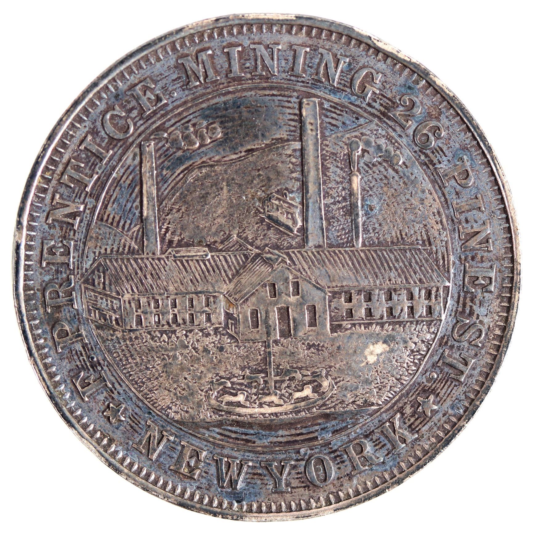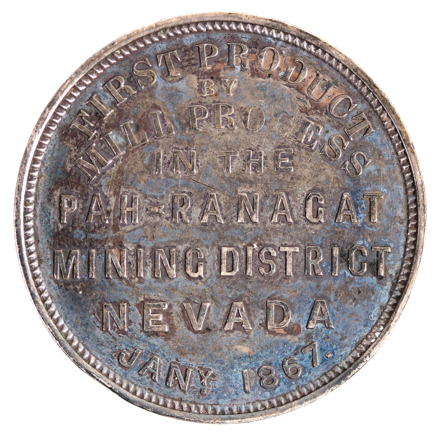 From one of the most obscure mining districts in Nevada, and at the time was one of the remotest in the United States, located in east-central Nevada. There was essentially nothing for about 100 miles (Austin). F. Prentice Mining 26 Pine St. / New York / (pictorial mill) // First Product / By Mill Process / In The / Pah-Ranagat / Mining District / Nevada / Jan. 1857; silver, rd., 31 mm. EF-AU condition.