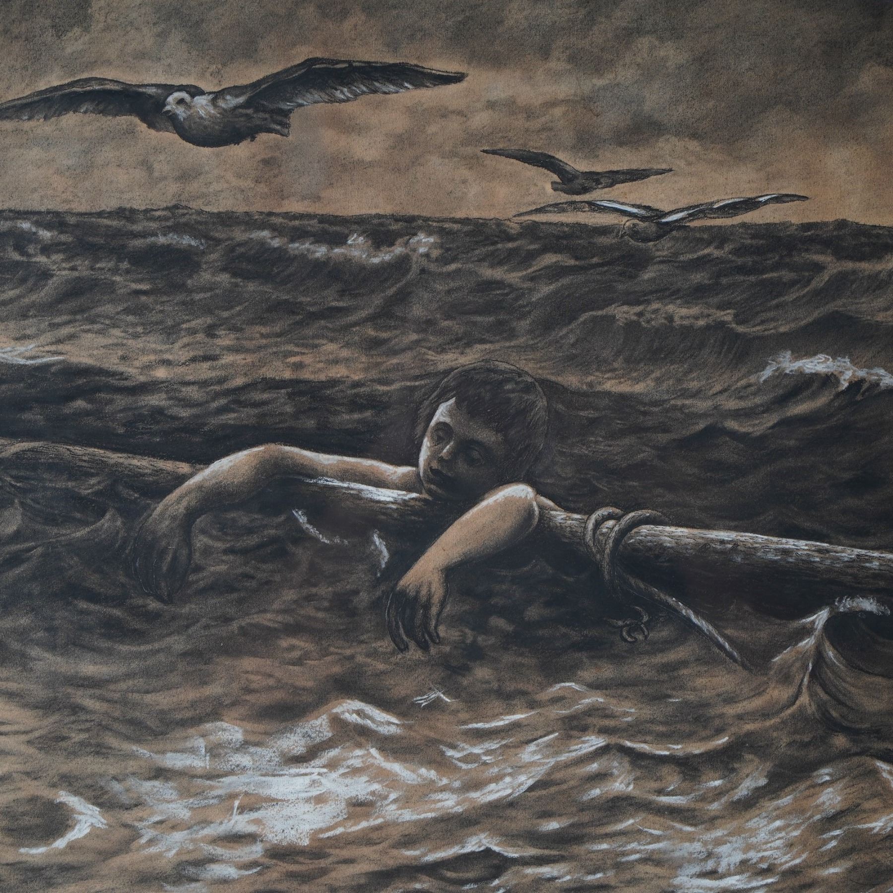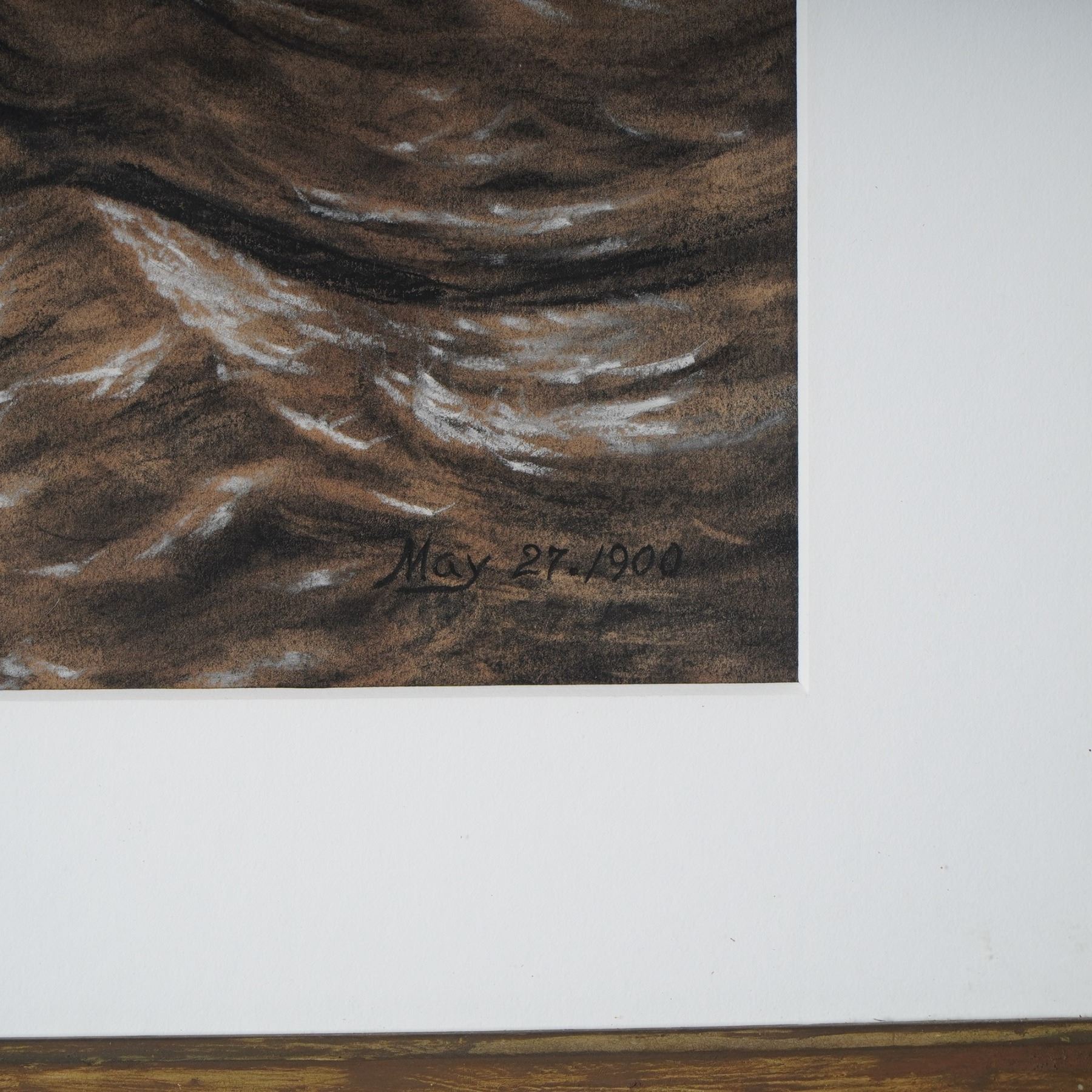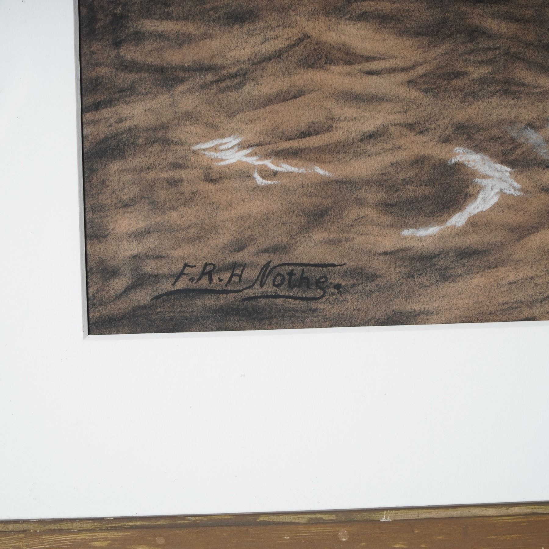 Stunning and emotionally evocative original greasy pastel on paper that is a faithful interpretation of the iconic En Derive (Adrift) by acclaimed French painter Emile Renouf. This haunting maritime scene captures a young boy adrift on a makeshift raft, eyes closed and body limp, encircled by churning waves and circling seagulls beneath a turbulent sky. The work is signed lower left by F. R. H. Nothe and dated May 27, 1900, a testament to the enduring influence of Renouf's deeply humanist vision. Nothe, though lesser known, demonstrates remarkable technical finesse and sensitivity in this interpretation, rendering the textures of sea and sky with dramatic chiaroscuro in earthy tones. The piece is beautifully presented in a distressed giltwood frame that enhances its historical resonance. A rare opportunity to acquire a powerful period interpretation of one of the late 19th century's most poignant images of vulnerability and endurance at sea.