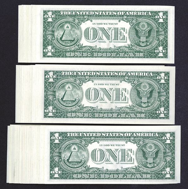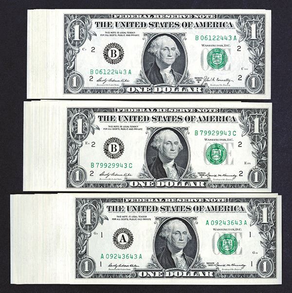 Federal Reserve. $1. 1969 (20), 1969A (12), 1969B (13). Many different district-block combinations included. No Star notes. All Choice Uncirculated. 45 pieces
