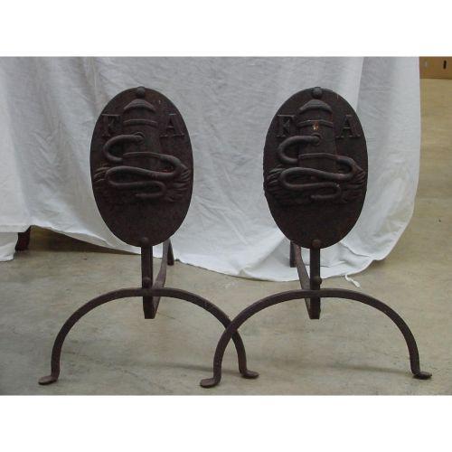 Oval iron plaques that were placed on the fronts of buildings years ago to show you had paid for fire protection, now made into andirons, marked F & S with a coiling snake, around what may be a fire hydrant, the actual medallion is 12" tall by 7" wide and the overall dimensions of the andirons are 21" tall by 17" wide by 22" deep. If you have any specific questions about any markings that may be on the back of the medallions, please feel free to email with a question as I am not sure about these pieces markings.
