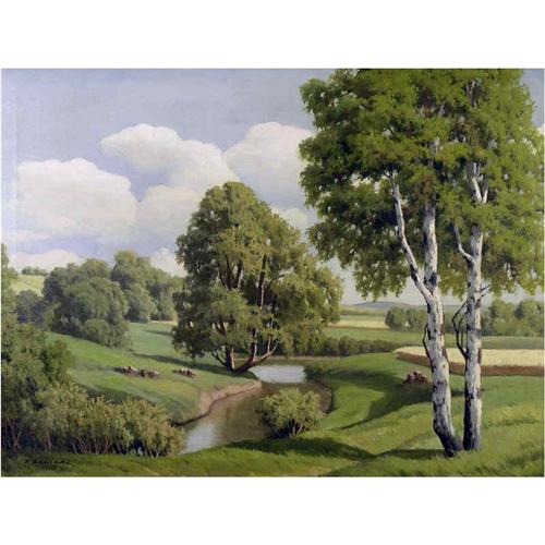 European [20th century] FARMLAND WITH MEANDERING CREEK oil on canvas 24 x 32 in. (61 x 81.3 cm) signed