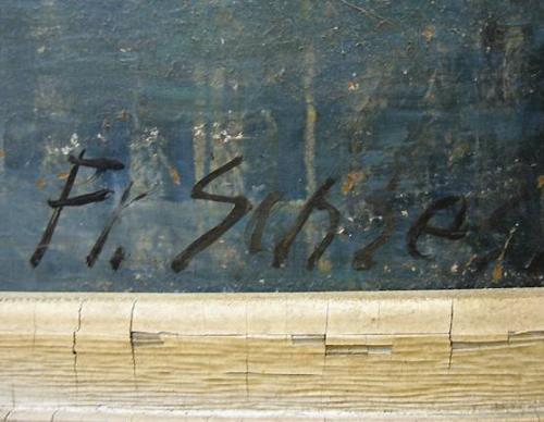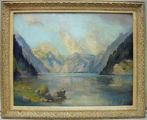 F. Schiess oil on board of mountain lake; late 19th C.; signed (L.R.); framed; image measures 23 1/2" x 29 3/4" (needs cleaning)
