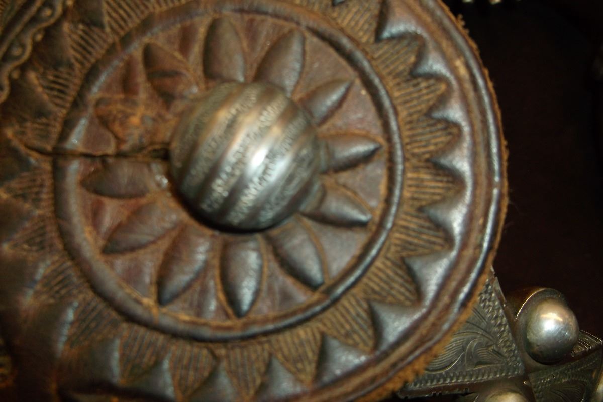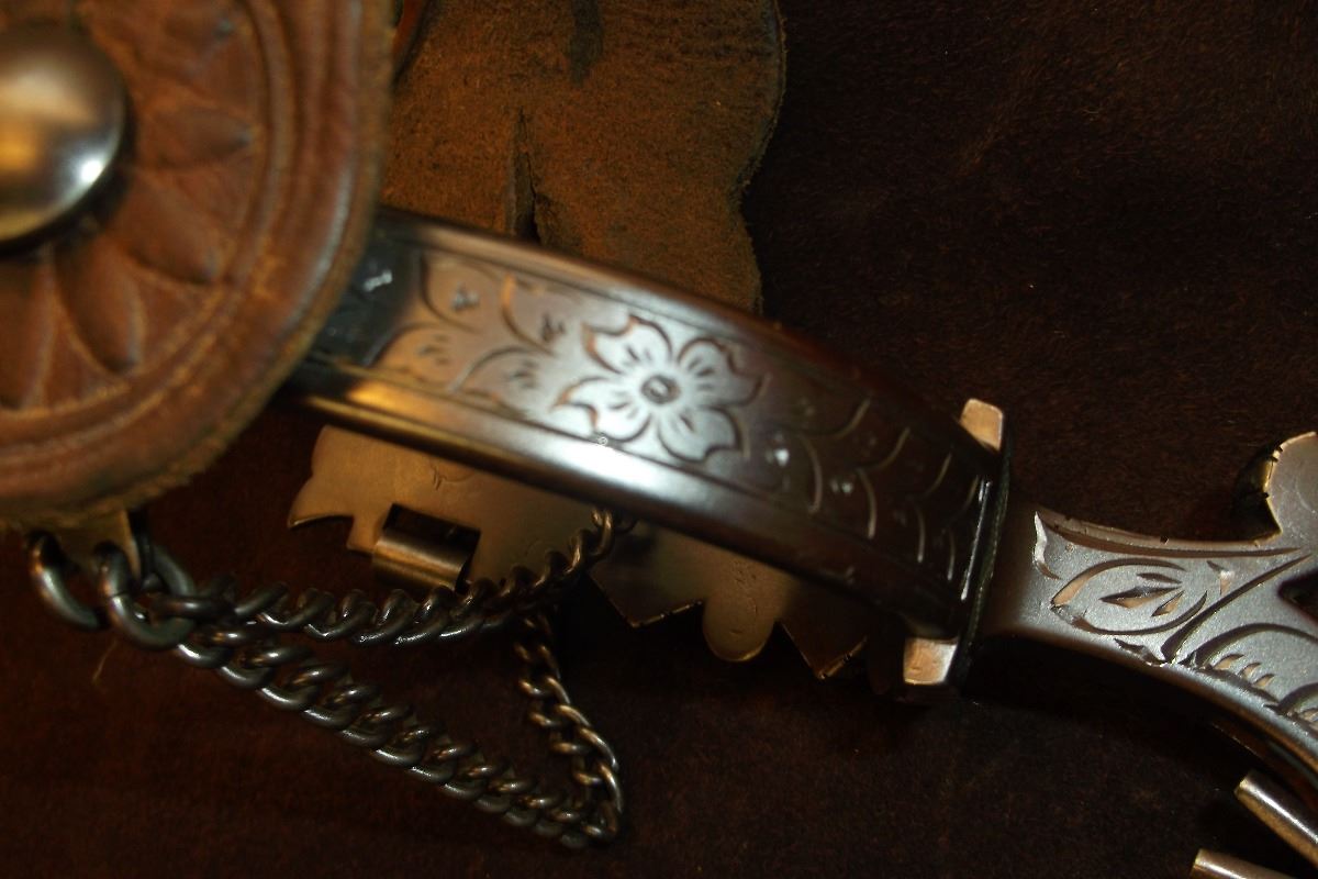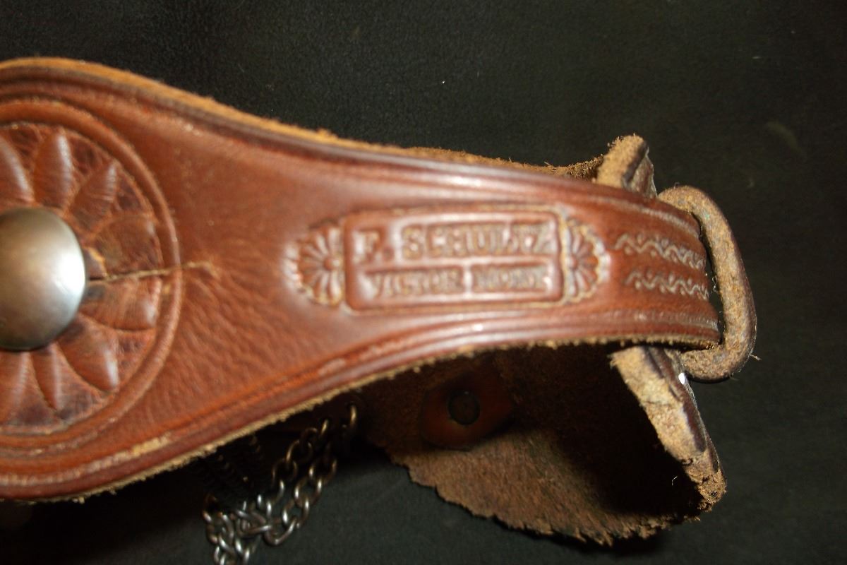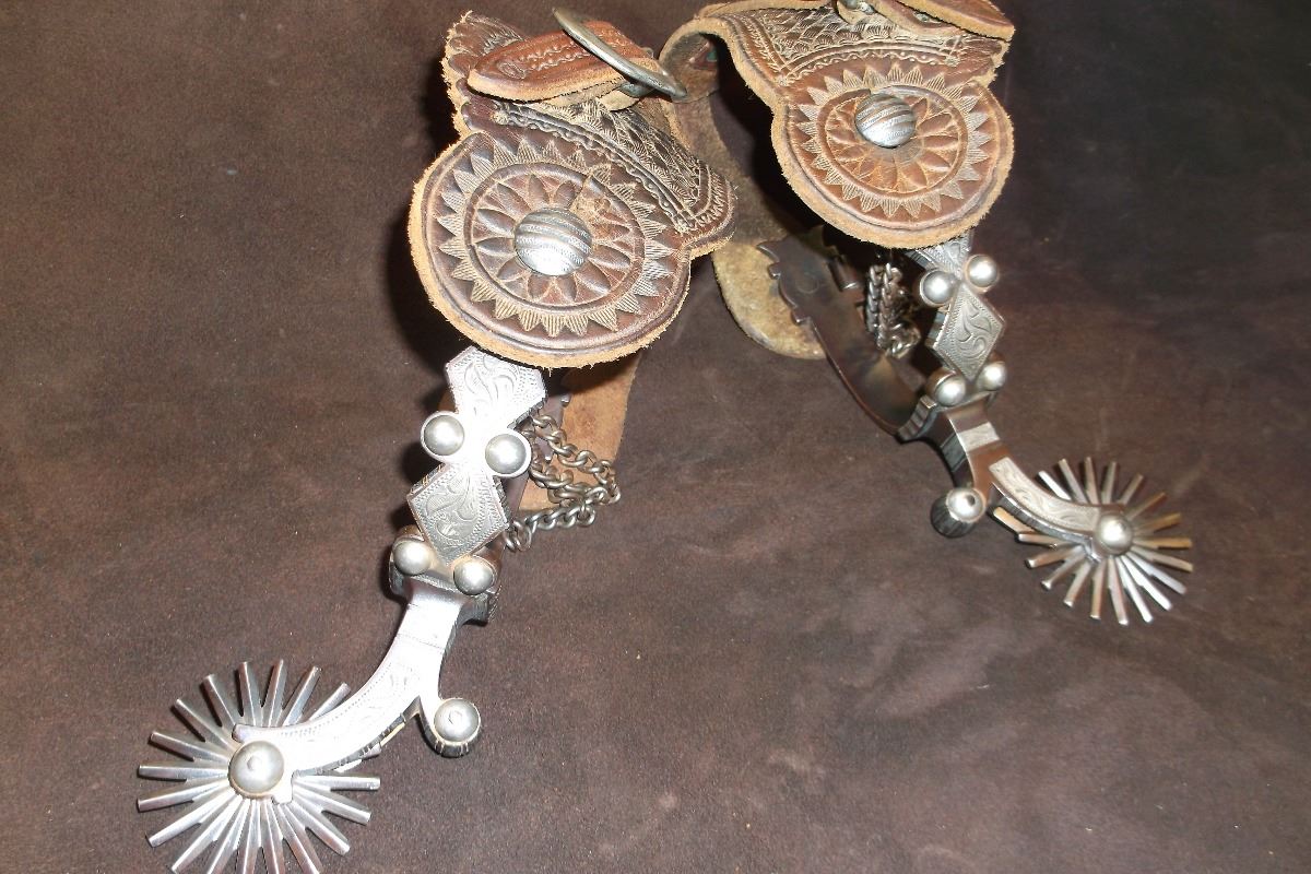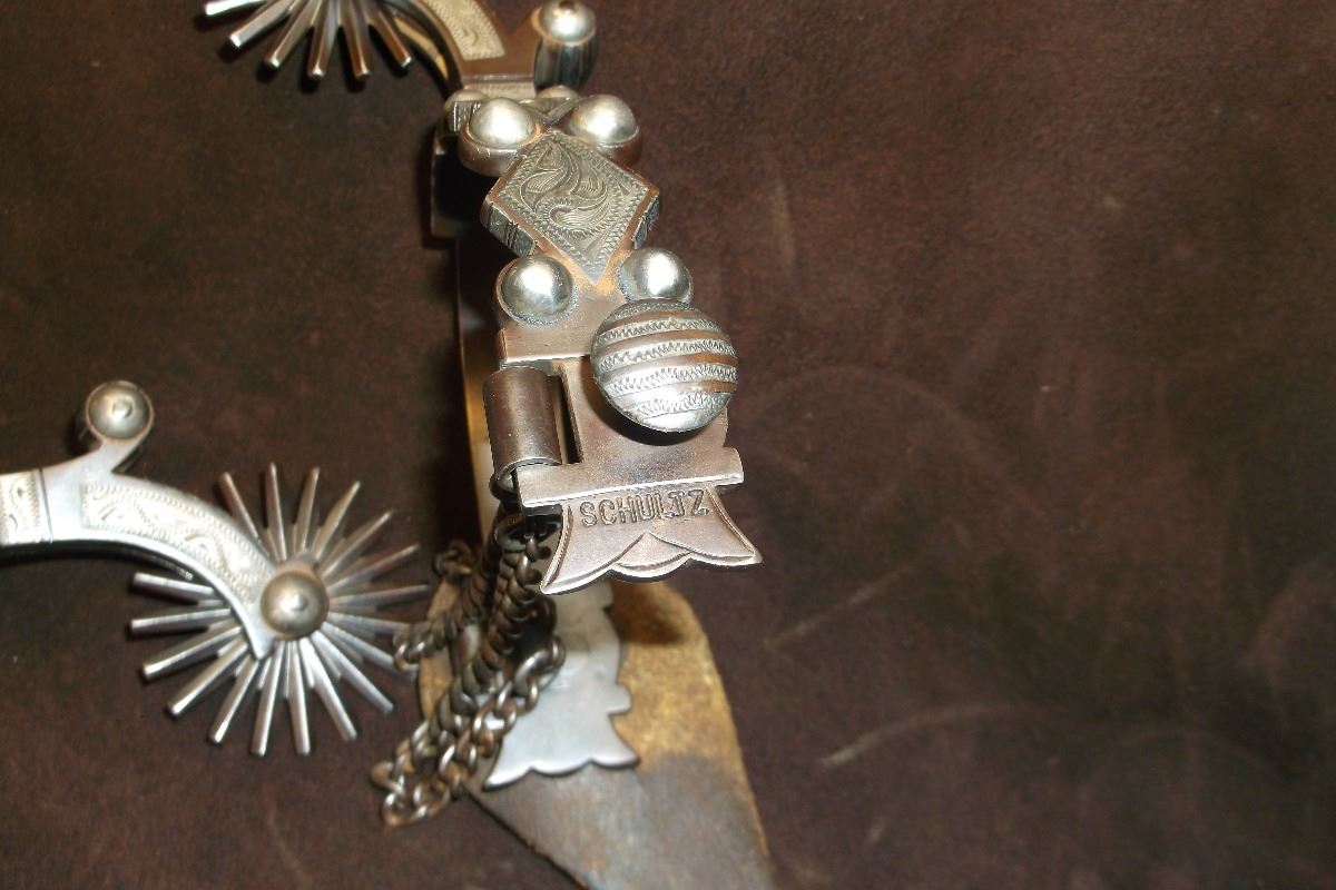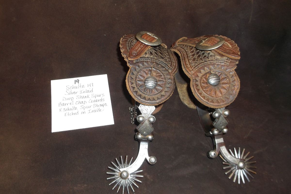 F. Schultz 147 Silver Inlaid Drop Shank Spurs- Barrel Chap Guards- F. Shultz Spur Straps- Etched on