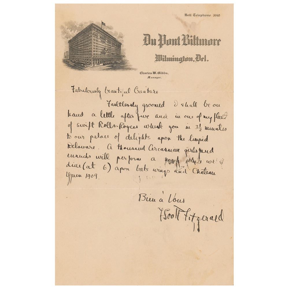 ALS signed "F. Scott Fitzgerald," one page, 6 x 9.5, DuPont Biltmore letterhead, no date. From the lobby of the Biltmore Hotel in Wilmington, Fitzgerald addresses Claire as a "Fabulously beautiful Creature," writing, in full: "Faultlessly groomed I shall be on hand a little after five and in one of my fleet of swift Rolls-Royces whisk you in a 3 1/2 minutes to our palace of delights upon the limpid Delaware. A thousand Circassian girls and eunuchs will perform a march while we dine (at 6) upon bats wings and Chateau Yquem 1909."