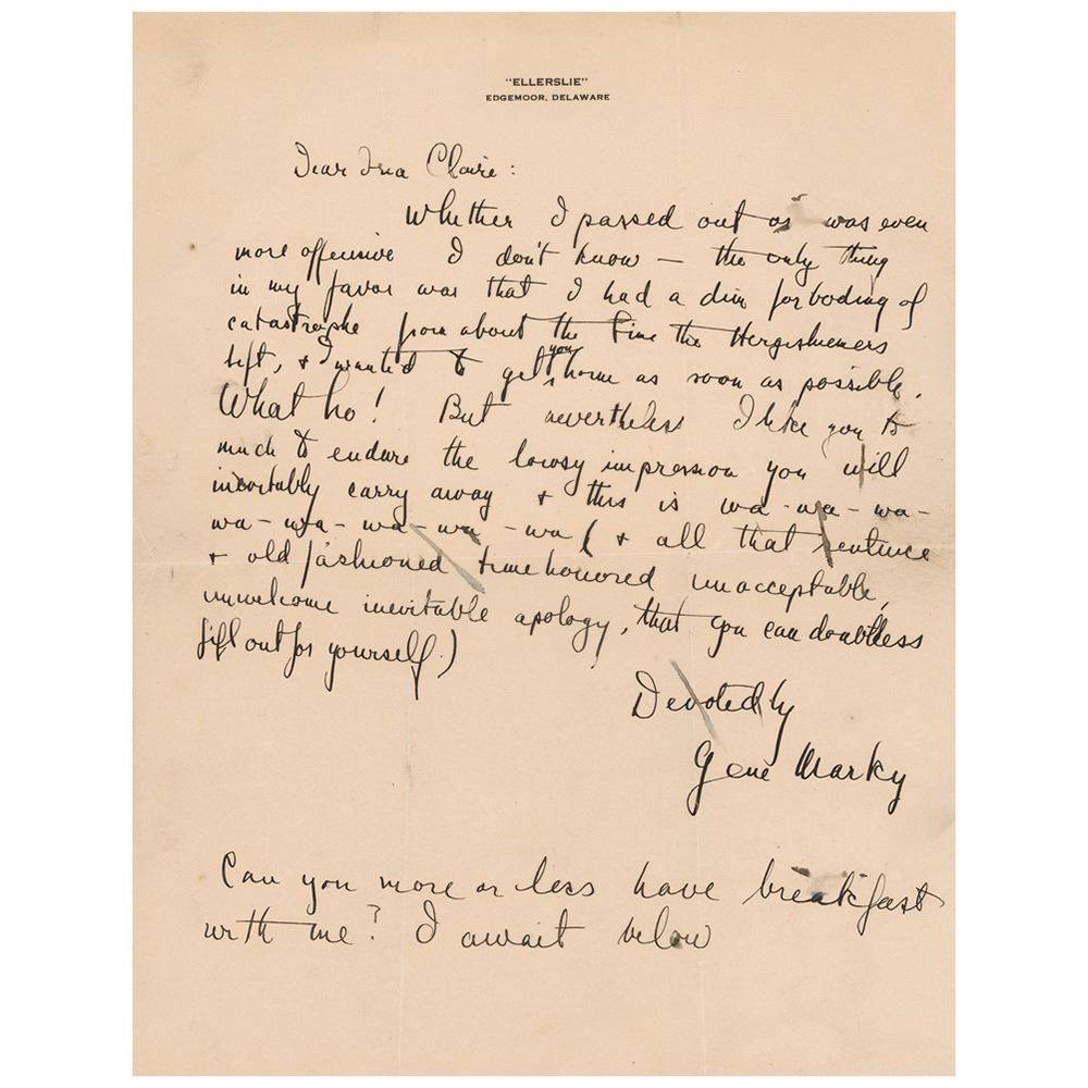ALS by Fitzgerald, playfully signed "Gene Marky," one page, 8.5 x 11, Ellerslie letterhead, no date [but the morning after the previous letter]. Handwritten letter to "Ina Claire," apologizing for his previous night's behavior. The possibilities of the last letter evaporate in the first line of this note, written the next morning in the fog of a hangover. In full: "Whether I passed out or was even more offensive I don't know—the only thing in my favor was that I had a dim foreboding of catastrophe from about the time the Hergesheimers left, & I wanted to get you home as soon as possible. What ho! But nevertheless less I like you too much to endure the lousy impression you will inevitably carry away & this is wa-wa-wa-wa-wa-wa-wa-wa (& all that sentence & old fashioned time honored unacceptable, unwelcome inevitable apology, that you can doubtless fill out for yourself)." He adds a wistful postscript: "Can you more or less have breakfast with me? I await below." In overall fine condition, with scattered small stains.