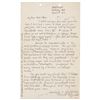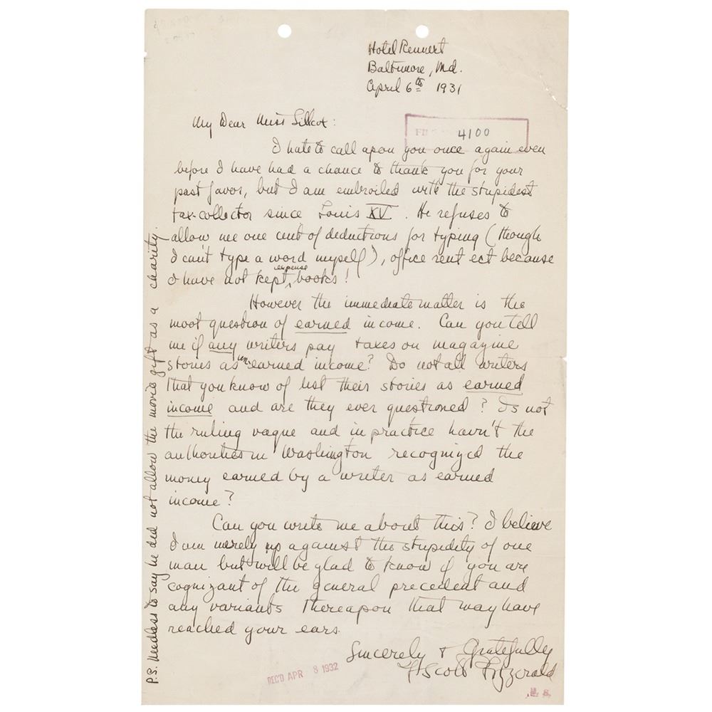 ALS signed “Sincerely & Gratefully, F. Scott Fitzgerald,†one page, 8.5 x 14, April 6, 1931. Letter to "Miss Sillcot," in full: "I hate to call upon you once again well before I have had a chance to thank you for your past favor, but I am embroiled with the stupidest tax-collector since Louis XV. He refuses to allow me one cent of deductions for typing (though I can't type a word myself), office rent ect because I have not kept expense books! However the immediate matter is the moot question of earned income. Can you tell me if any writers pay taxes on magazine stories as un-earned income? Do not all writers that you know of list their stories as earned income and are they ever questioned? Is not the ruling vague and in practice haven't the authorities in Washington recognized the money earned by a writer as earned income? Can you write me about this? I believe I am merely up against the stupidity of one man but will be glad to know if you are cognizant of the general precedent and any variants thereupon that may have reached your ears." He adds a postscript along the left edge: "P.S. Needless to say he did not allow the movie gift as a charity." In very good to fine condition, with overall creasing, and a repaired tear to the upper right edge.