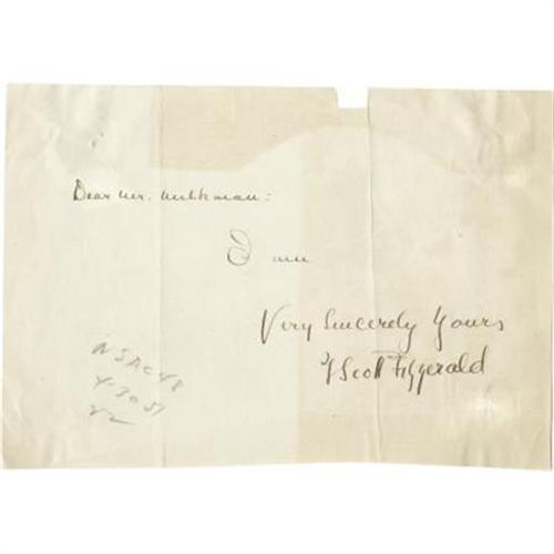<B>F. Scott Fitzgerald Autograph Note Signed</B></I> “<I>F. Scott Fitzgerald,</B></I>” one page, 7.25" x 5". In full, “<I>Dear Mr. Milkman:/I am/Very Sincerely Yours.</B></I>” Three small pieces of mounting tape have been removed from the verso at three corners resulting in a thinning of the paper which shows through especially in a blank area at the lower right of the signature and behind "<I>Dear M</B></I>" in the salutation. Two vertical folds, one passing through the "<I>tt</B></I>" of the signature. There is a tear at the upper edge near the right fold. Light pencil notations in unknown hand in lower left blank area. Proper matting would visually eliminate the defects. Overall, in fine condition. Novelist and short story writer F. Scott Fitzgerald, regarded as one of the greatest authors of the 20th century, was only 44 when he died in 1940. His works include <I>This Side of Paradise,</B></I> <I>The Great Gatsby,</B></I> and <I>Tender is the Night.</B></I> <I>Ex. Henry E. Luhrs Collection.</B></I><BR><BR><b>Shipping:</b> Flat Material, Small (<a target="_blank" href="http://www.heritageauctions.com/common/shipping.php">view shipping information</a>)