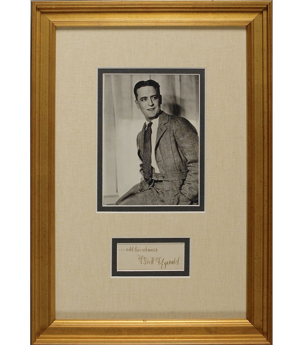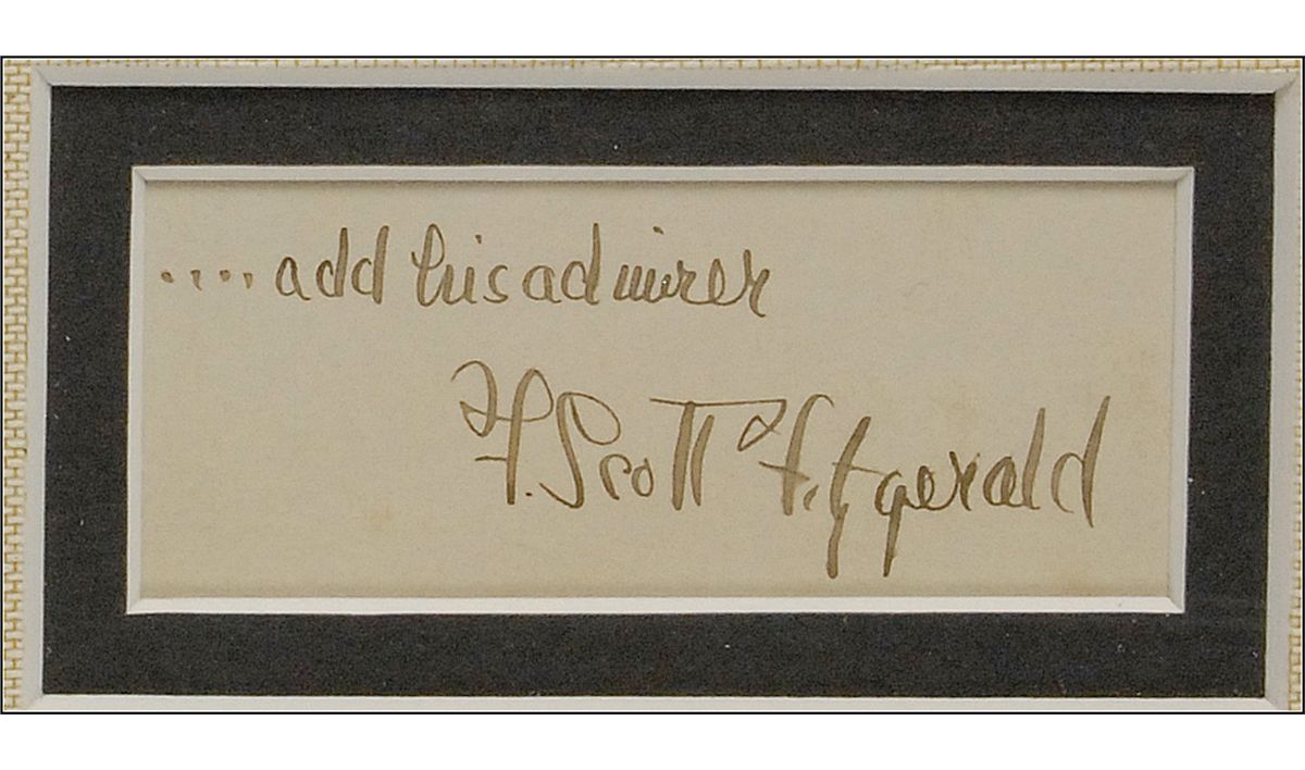 Jazz Age novelist and short story writer. He is regarded as one of the greatest American writers of the twentieth century. Fitzgerald was the self-styled spokesman of the “Lost Generation,” Americans born in the 1890s who came of age during World War I. He finished four novels, left a fifth unfinished, and wrote dozens of short stories that feature themes of youth, despair, and age. Fountain pen signature, “…add his admirer, F. Scott Fitzgerald,” on an off-white album page. Archivally double cloth matted and framed with a portrait of Fitzgerald, to an overall size of 11.75 x 17. In fine condition. A superb example of a desirable literary autograph.