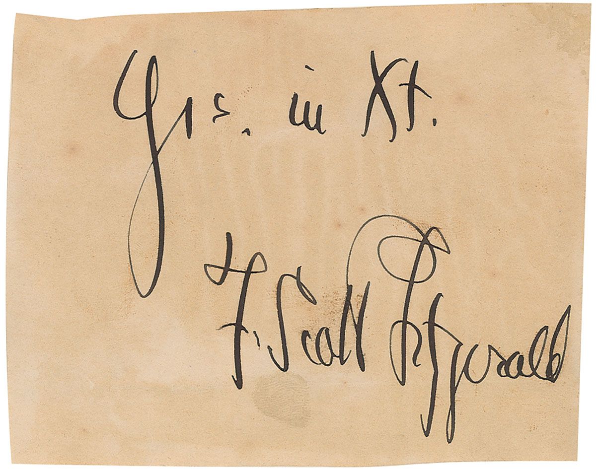 Vintage ink signature, “Yrs. in Xt., F. Scott Fitzgerald,” on an off-white 4 x 3.25 slip affixed to a 6.75 x 3.75 album page. In very good condition, with scattered toning and soiling, some slight rippling due to adhesive, and a couple spots of adhesive remnants to surface. The sentiment, short for “Yours in Christ,” is unusual coming from the typically-secular Fitzgerald—however, it was a closing often used by H. L. Mencken and others in a mocking fashion. Nevertheless, Fitzgerald was the first author of Catholic descent to achieve canonical success in America, making this an interesting associative piece.