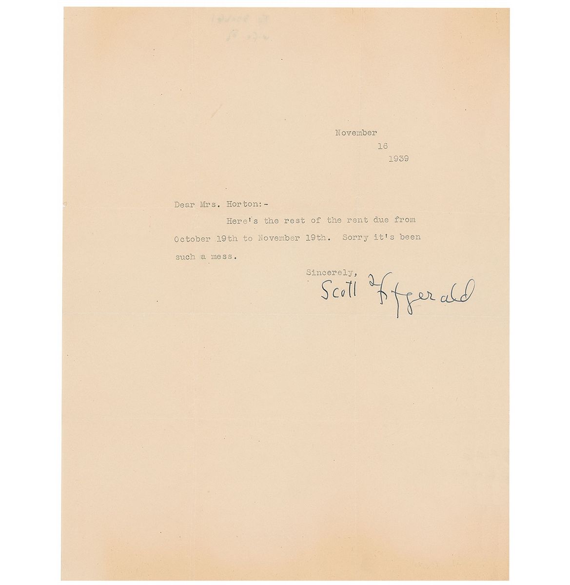 Rare TLS signed “Scott Fitzgerald,” one page, 8.5 x 11, November 16, 1939. Brief letter to Isabel Horton, sister of actor Edward Everett Horton. In full: “Here’s the rest of the rent due from October 19th to November 19th. Sorry it’s been such a mess.” In fine condition, with intersecting folds, one between first and last name of signature, scattered creases, and some mild edge toning. Fitzgerald rented a cottage from the Hortons in Encino, California, while trying to make money screenwriting—his contract with MGM expired at the beginning of 1939 and he relied on infrequent freelance work in order to make ends meet. However, his personal problems at times got in the way of these projects—he was hired in February 1939 to work on a film called Winter Carnival, but was fired shortly thereafter for drunkenness, which earned him a reputation throughout the industry as unreliable and a bad influence on the other writers.
