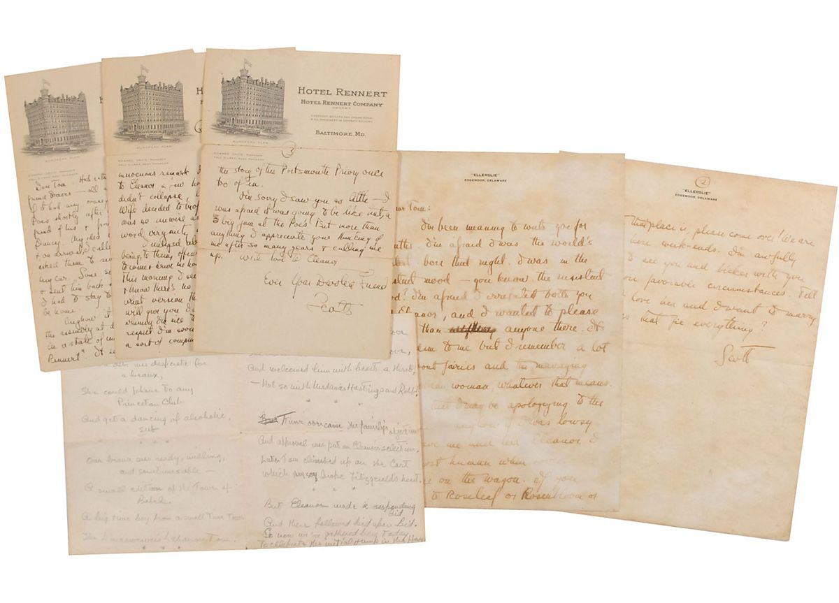 Two years after publishing The Great Gatsby, Fitzgerald’s literary career began to stagnate as he found himself at the center of the wild social scene of the roaring twenties. Frustrated with his lack of progress, he and Zelda moved into the decadent Ellerslie mansion in 1927 so he could concentrate on writing his next novel. While he did begin work on Tender Is the Night, the bulk of his time continued to be spent hosting extravagant parties, and his reputation as a notorious alcoholic grew. Written from Ellerslie, the first of these two extraordinary letters to his longtime friend and former Princeton classmate, Tom Lineaweaver, reveals the embarrassment of the wild author for his self-indulgent behavior, deeply apologizing for his drunken social missteps and begging forgiveness from his friends. Indicating his willingness to change, he writes, “I can be almost human when sober…We are on the wagon.” The second letter, however (likely written four or five years later, when Fitzgerald moved into the Hotel Rennert in Baltimore) belies the previous claim, as he again finds himself explaining his “offensive” behavior. After leaving a party at the Poes—the grandsons of Edgar Allen Poe’s cousin, who attended Princeton as well—Fitzgerald was seemingly forced into company that he had little patience for, leading to a series of off-colored comments that shocked the guests. With the additional unpublished poem—which gives insight and depth to this friendship that spanned decades, as it was seemingly written for Tom and Eleanor’s wedding on June 28, 1920—this is a remarkable collection from the highly sought-after American icon, with abundant references to his notorious drinking and riotous parties.
