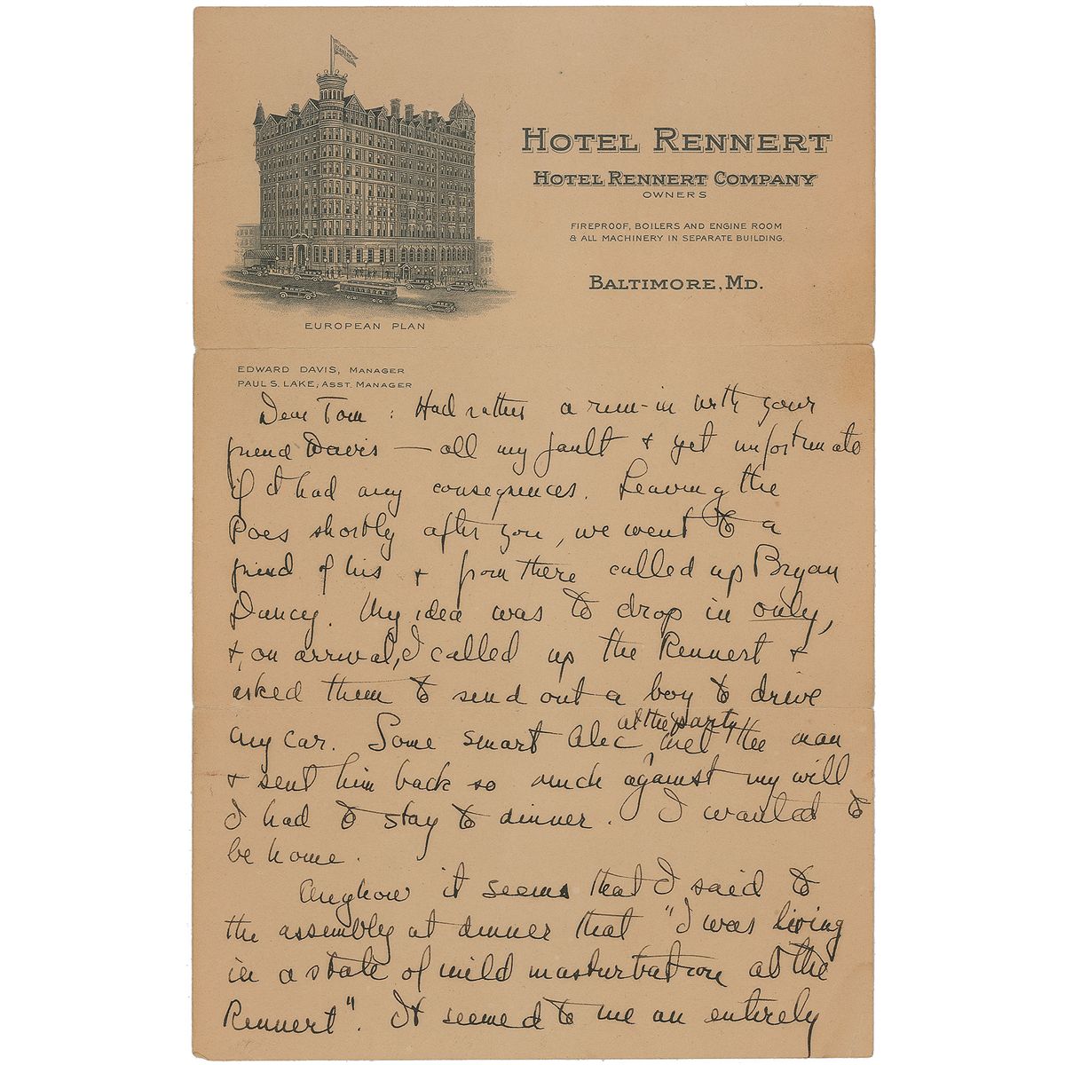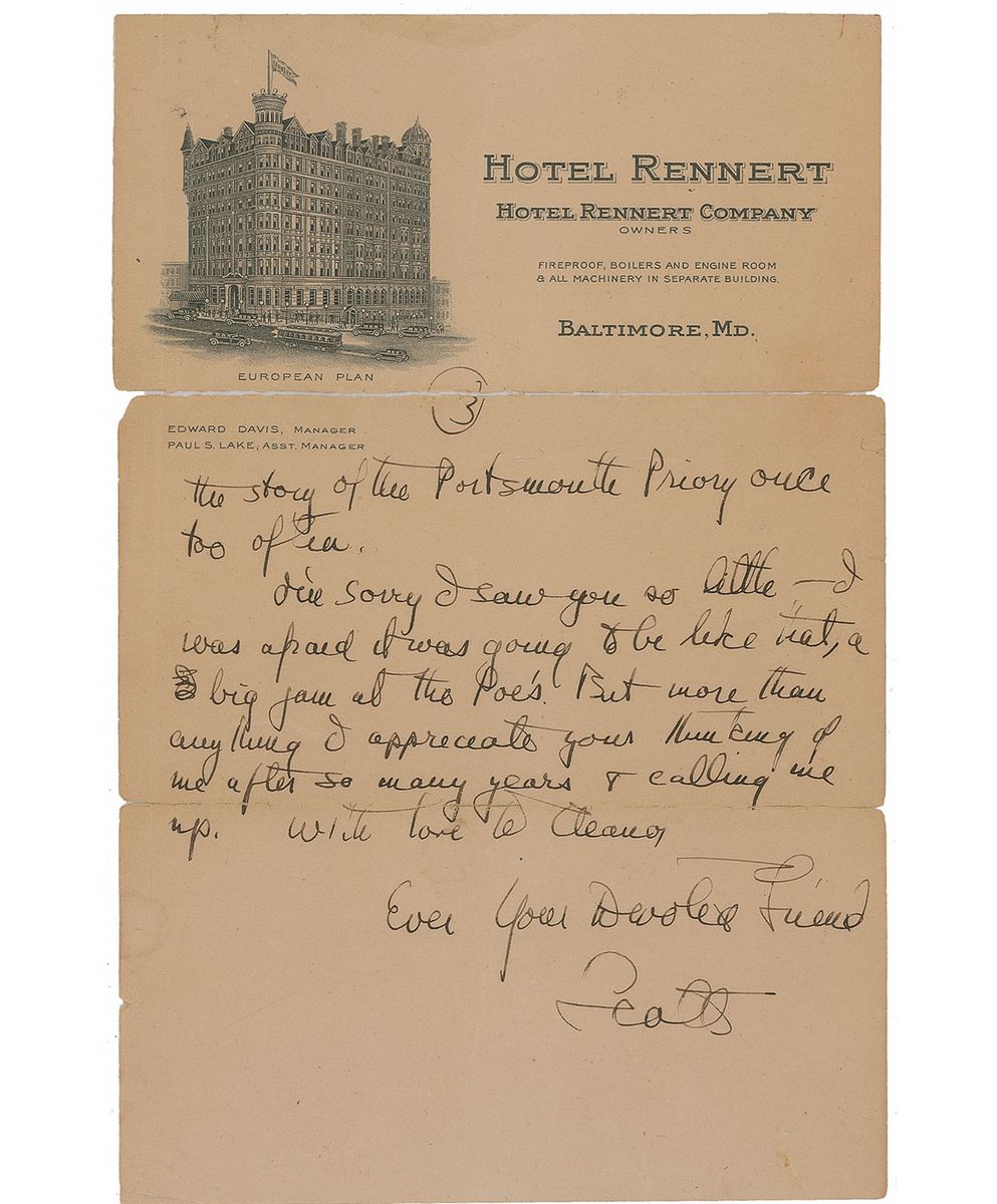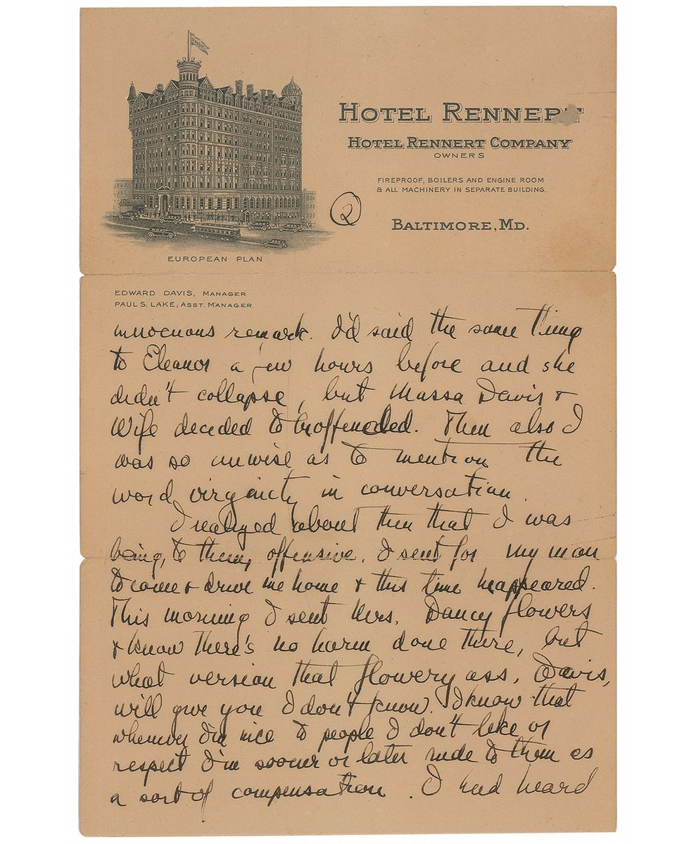 Second ALS, signed “Your devoted friend, Scott,” three pages, 6 x 9.25, Hotel Rennert, Baltimore, Maryland, letterhead, no date [but circa 1932]. In part: “Had rather a run-in with your friend Davis—all my fault & yet unfortunate if it had any consequences. Leaving the Poes shortly after you, we went to a friend of his & from there called up Bryan Dancy. My idea was to drop in only, & on arrival, I called up the Rennert & asked them to send out a boy to drive any car. Some smart alec at the party met the man & sent him back so much against my will I had to stay to dinner. I wanted to be home. Anyhow it seems that I said to the assembly at dinner that ‘I was living in a state of mild masturbation at the Rennert.’ It seemed to me an entirely innocuous remark. I’d said the same thing to Eleanor a few hours before and she didn’t collapse, but Massa Davis & Wife decided to be offended. Then also I was unwise as to mention the word virginity in conversation. I realized about then that I was being to them, offensive. I sent for my man to come & drive me home & this time he appeared. This morning I sent Mrs. Dancy flowers & know there’s no harm done there, but what version that flowery ass, Davis, will give you I don’t know. I know that whenever I’m nice to people I don’t like or respect I’m sooner or later rude to them as a sort of compensation. I had heard the story of the Portsmouth Priory once too often.”