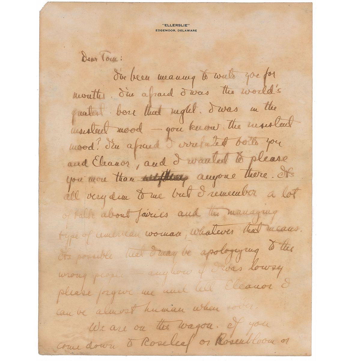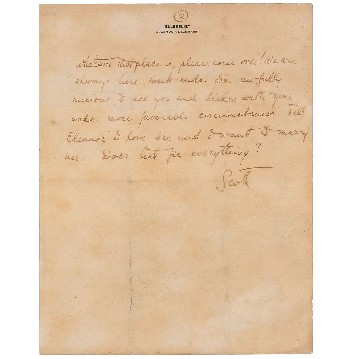 Two letters and a handwritten poem from Fitzgerald to his college friend Tom Lineaweaver. First ALS, signed “Scott,” two pages, 8.5 x 11, Ellerslie letterhead, no date [but circa 1927-28]. In part: “I’m afraid I was the world’s greatest bore that night. I was in the resistant mood—you know, the resistant mood? I’m afraid I irritated both you and Eleanor, and I wanted to please you more than anyone there. It’s all very dim to me but I remember a lot of talk about fairies and the managing type of American women, whatever that means. It’s possible I may be apologizing to the wrong people—anyhow if I was lousy please forgive me and tell Eleanor I can be almost human when sober. We are on the wagon....Tell Eleanor I love her and I want to marry her. Does that fix everything?”