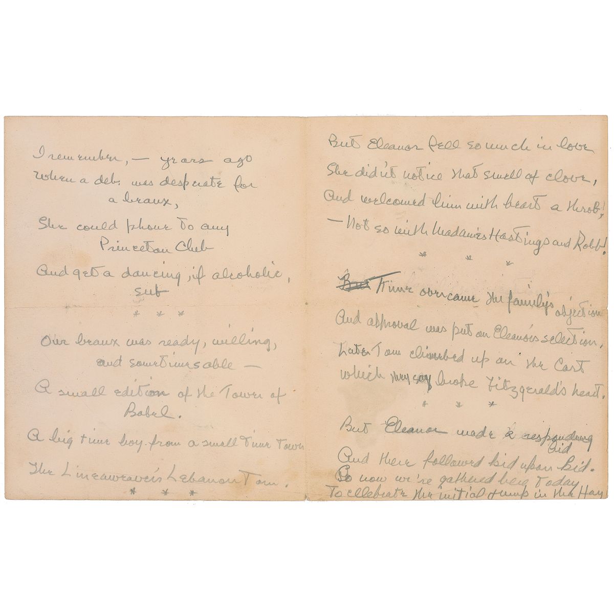 Also included is an unsigned, unpublished handwritten poem, across two adjoined sheets, 11 x 7, circa 1920. Fitzgerald writes 20 lines of verse, in pencil, about the courtship and marriage of Tom and Eleanor. Poem begins: “I remember—yrs ago / When a deb was desperate for / a beaux / She could phone to any / Princeton Club / And get a dancing, if alcoholic / sub.” Final two lines read, “So now we’re gathered here today / To celebrate the initial jump in the hay.”