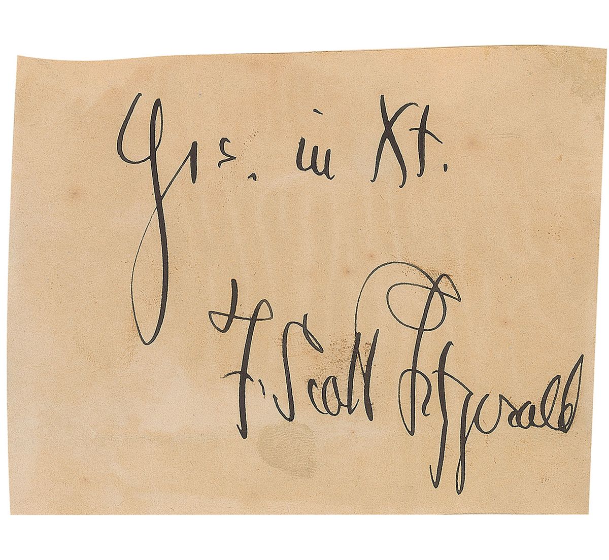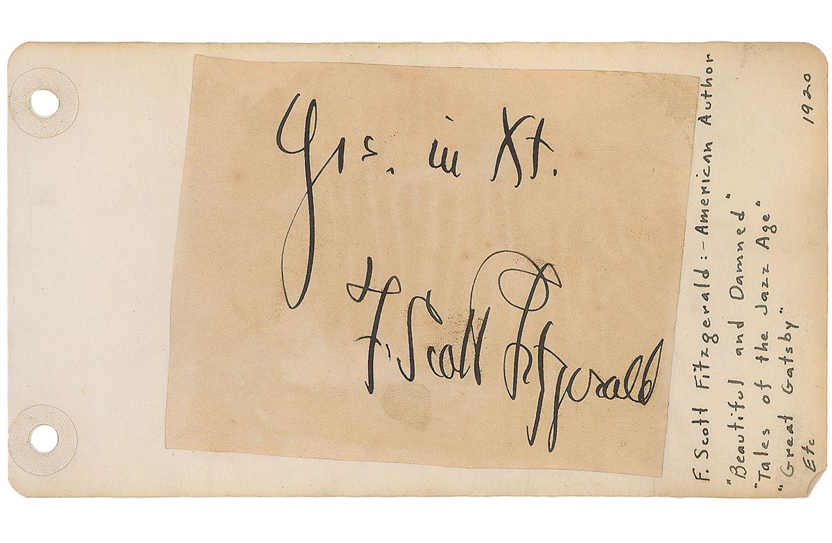 Vintage ink signature, “Yrs. in Xt., F. Scott Fitzgerald,” on an off-white 4 x 3.25 slip affixed to a 6.75 x 3.75 album page. In very good condition, with scattered toning and soiling, some slight rippling due to adhesive, and a couple spots of adhesive remnants to surface. The sentiment, short for ‘Yours in Christ,’ is unusual coming from the typically secular Fitzgerald—however, it was a closing often used by H. L. Mencken and others in a mocking fashion. Nevertheless, Fitzgerald was the first author of Catholic descent to achieve canonical success in America, making this an interesting associative piece.