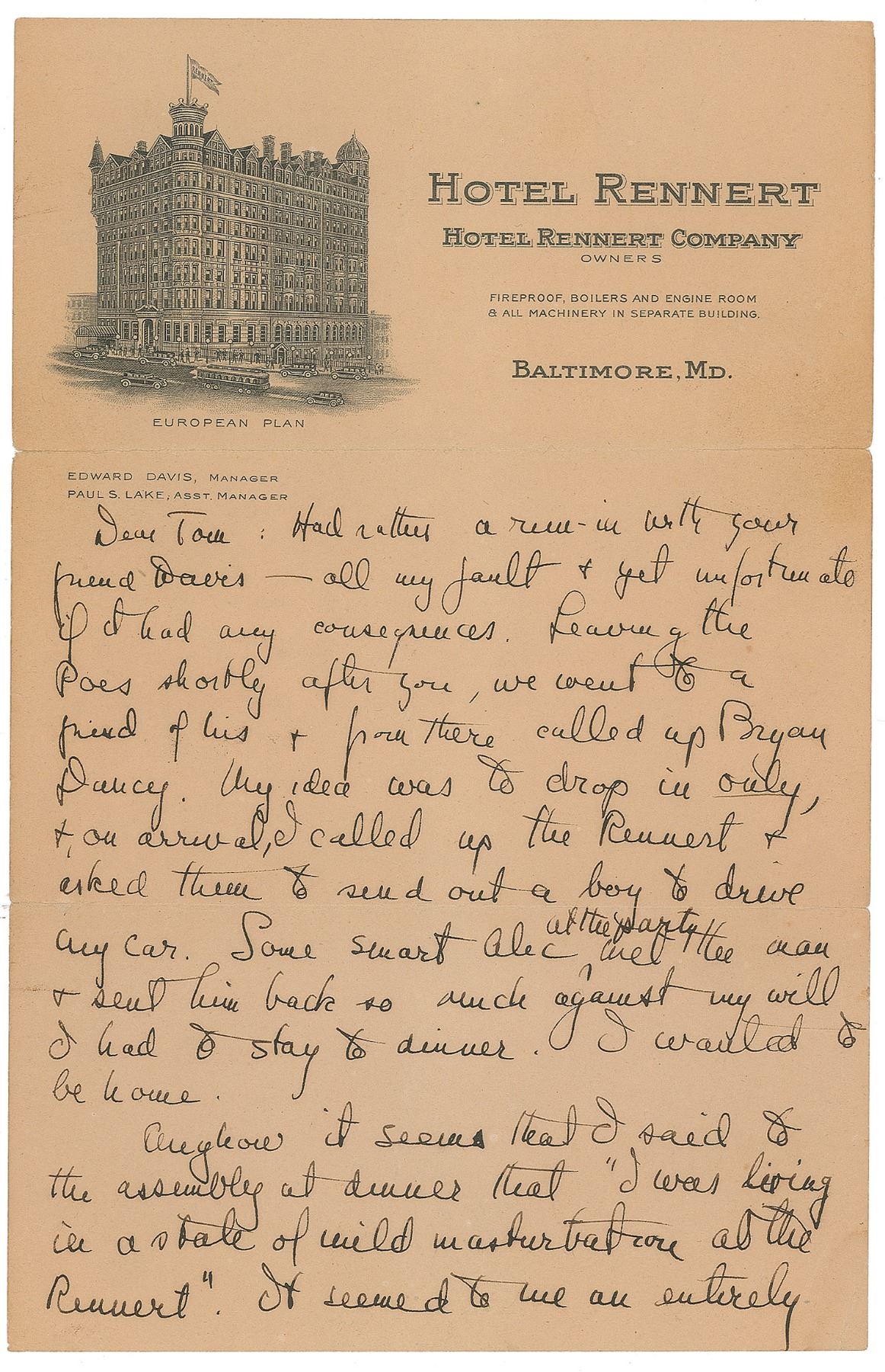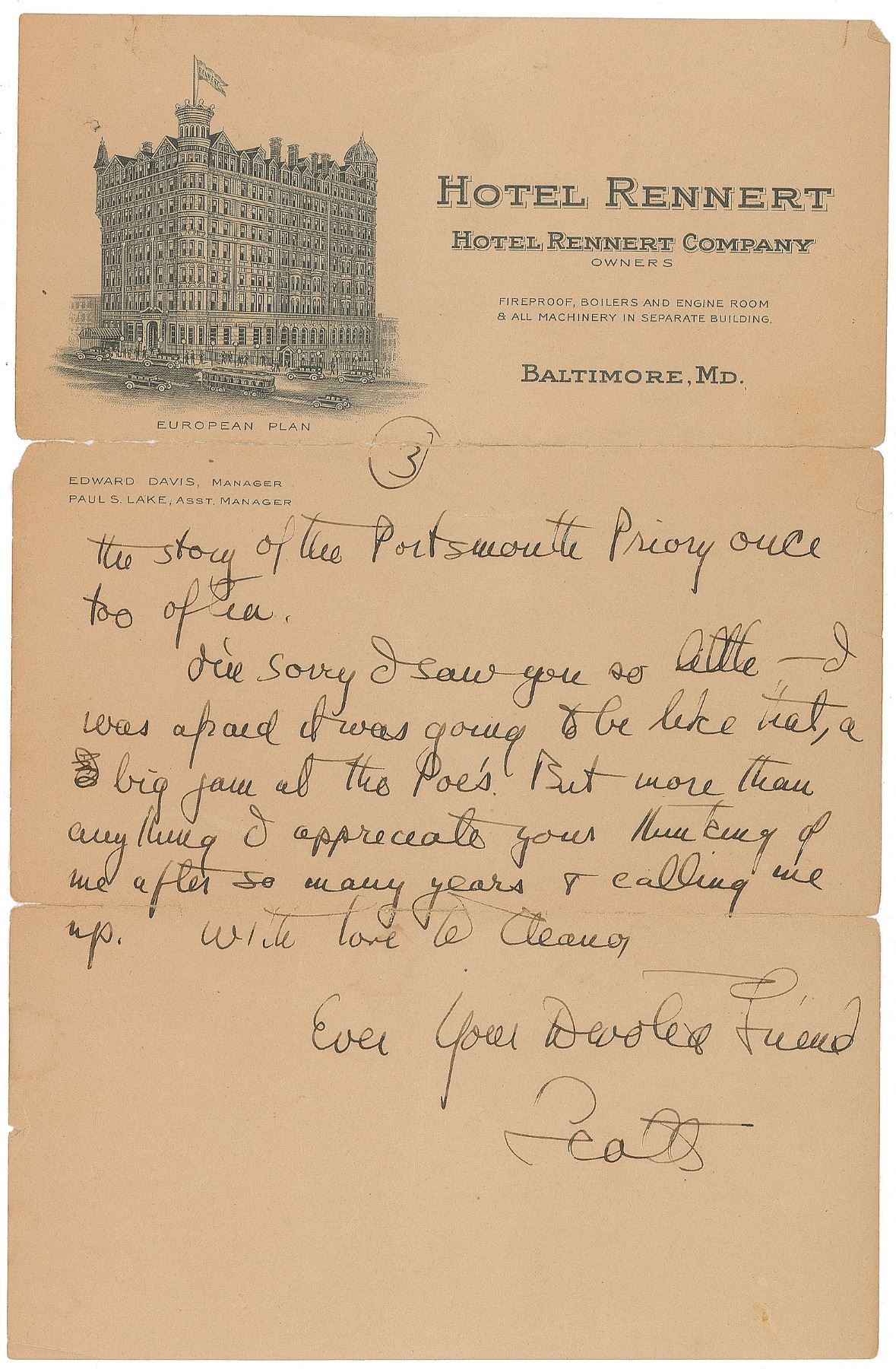 Fitzgerald lived at Baltimore’s Hotel Rennert from March 30–May 20, 1932, presumably dating the letter to this period. The recipient, Tom Lineaweaver, was Fitzgerald’s longtime friend and former Princeton classmate. In the humorous letter, Fitzgerald tells the story of his “offensive” behavior after leaving a party at the Poes—a reference to the grandsons of Edgar Allen Poe’s cousin, who attended Princeton as well. Fitzgerald was seemingly forced into company that he had little patience for, leading to a series of off-colored comments that shocked the guests. With the additional unpublished poem—which gives insight and depth to this friendship that spanned decades, as it was seemingly written for Tom and Eleanor's wedding on June 28, 1920—this is a remarkable collection from the highly sought-after American icon, boasting references to his attendance at riotous Jazz Age parties.