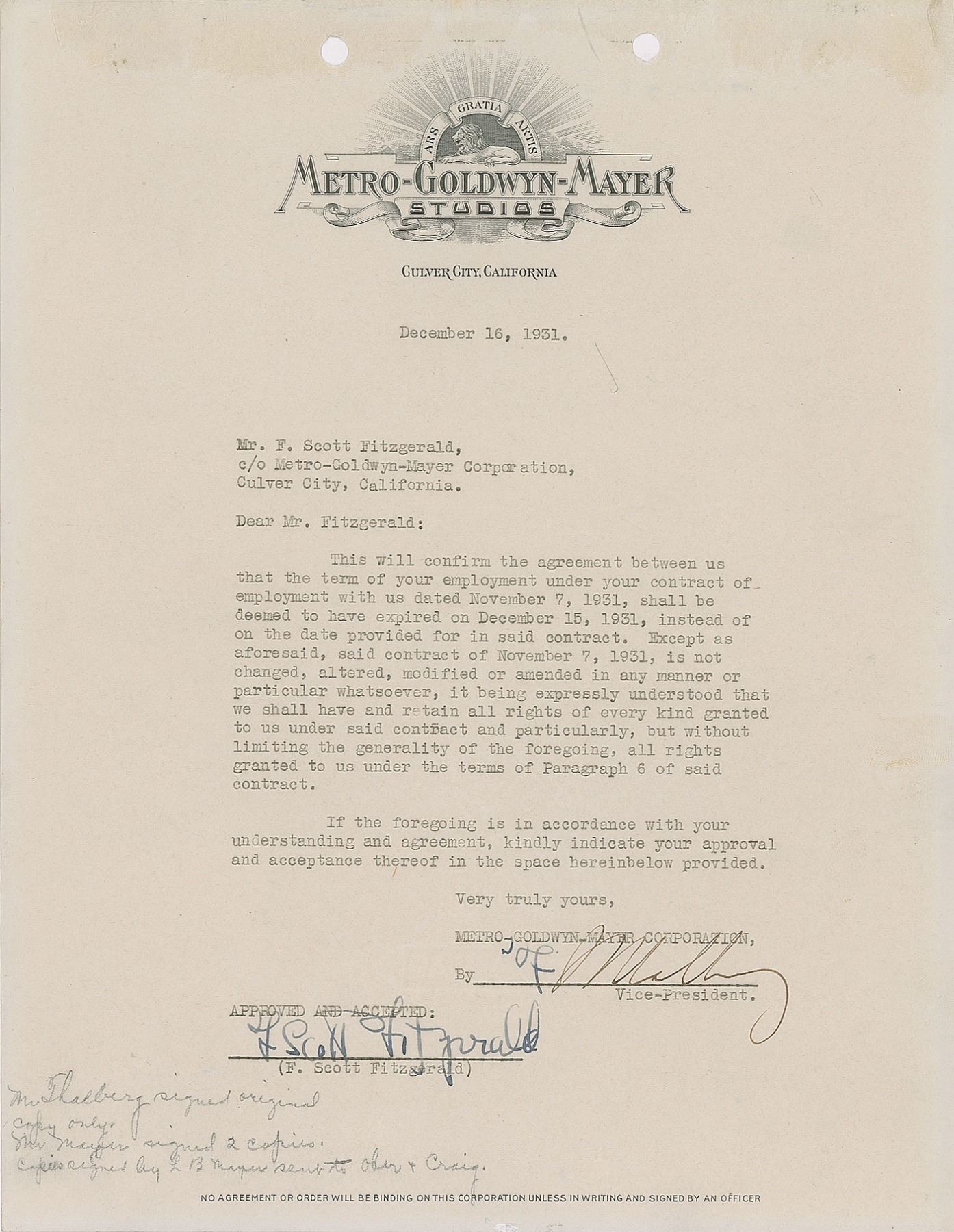 DS, one page, 8.5 x 11, December 16, 1931. Official Metro-Goldwyn-Mayer document in which Fitzgerald confirms an agreement to modify the end date of his contract, in part: "This will confirm the agreement between us that the term of your employment under your contract of employment with us dated November 7, 1931, shall be deemed to have expired on December 15, 1931…it being expressly understood that we shall have and retain all rights of every kind granted to us under said contract." Signed at the conclusion in fountain pen by the esteemed Jazz Age author, "F. Scott Fitzgerald," (who also adds the initial "F" to the wrong line), and countersigned by Vice President Irving Thalberg, "I. Thalberg." A pencil annotation at the bottom notes: "Mr. Thalberg signed original copy only. Mr. Mayer signed 2 copies. Copies signed by L. B. Mayer sent to Ober & Craig." Harold Ober was Fitzgerald's literary agent. In fine condition, with wrinkling along the top edge.