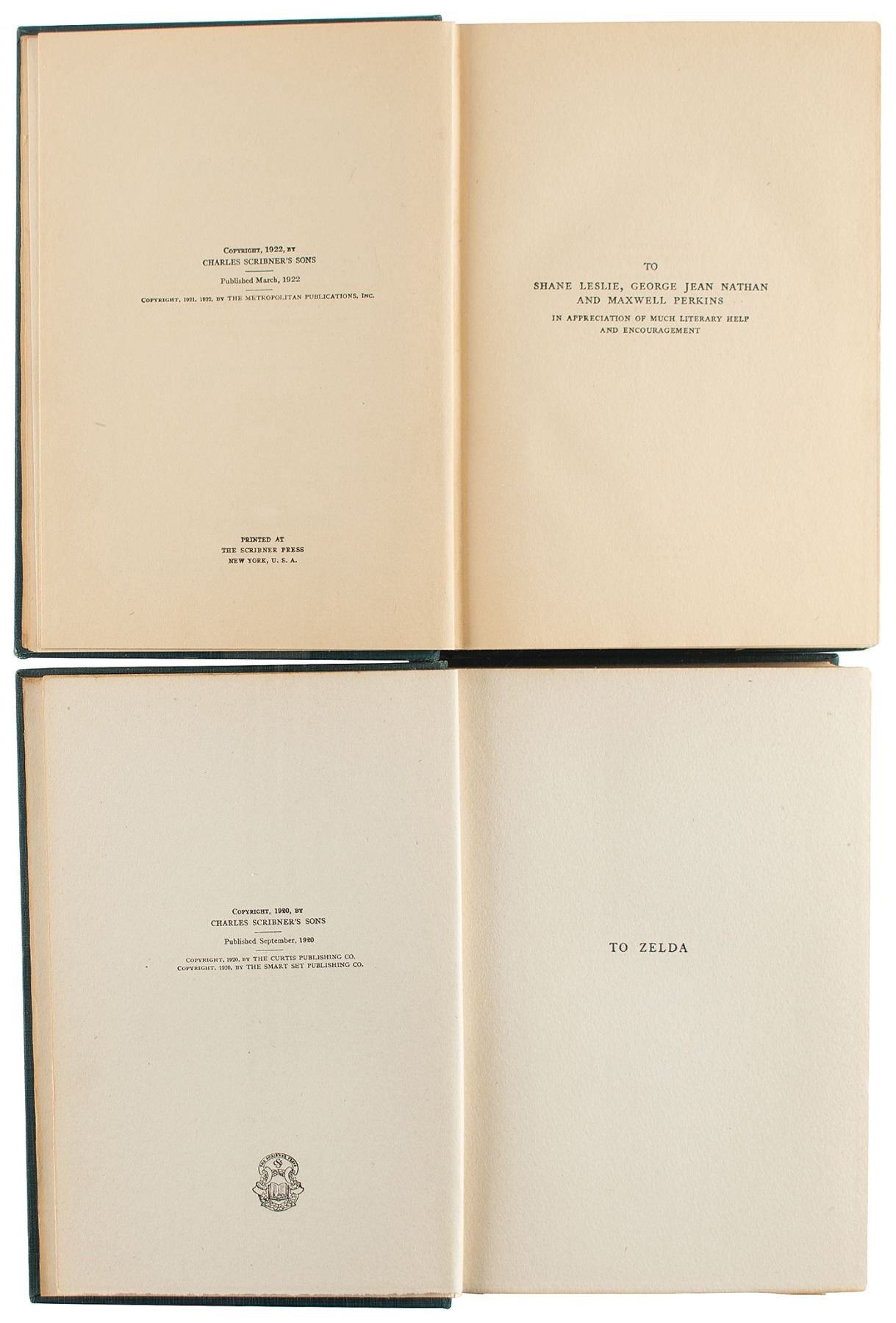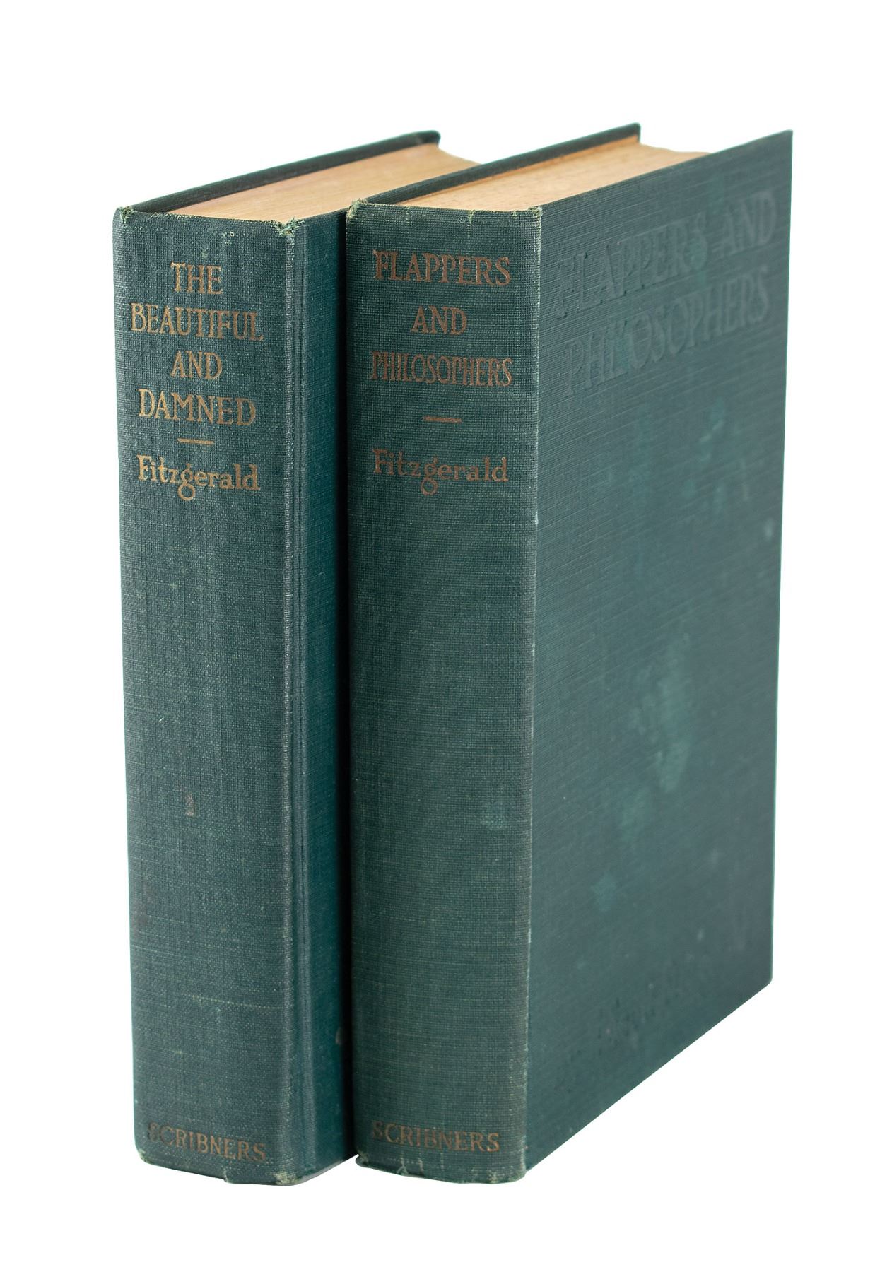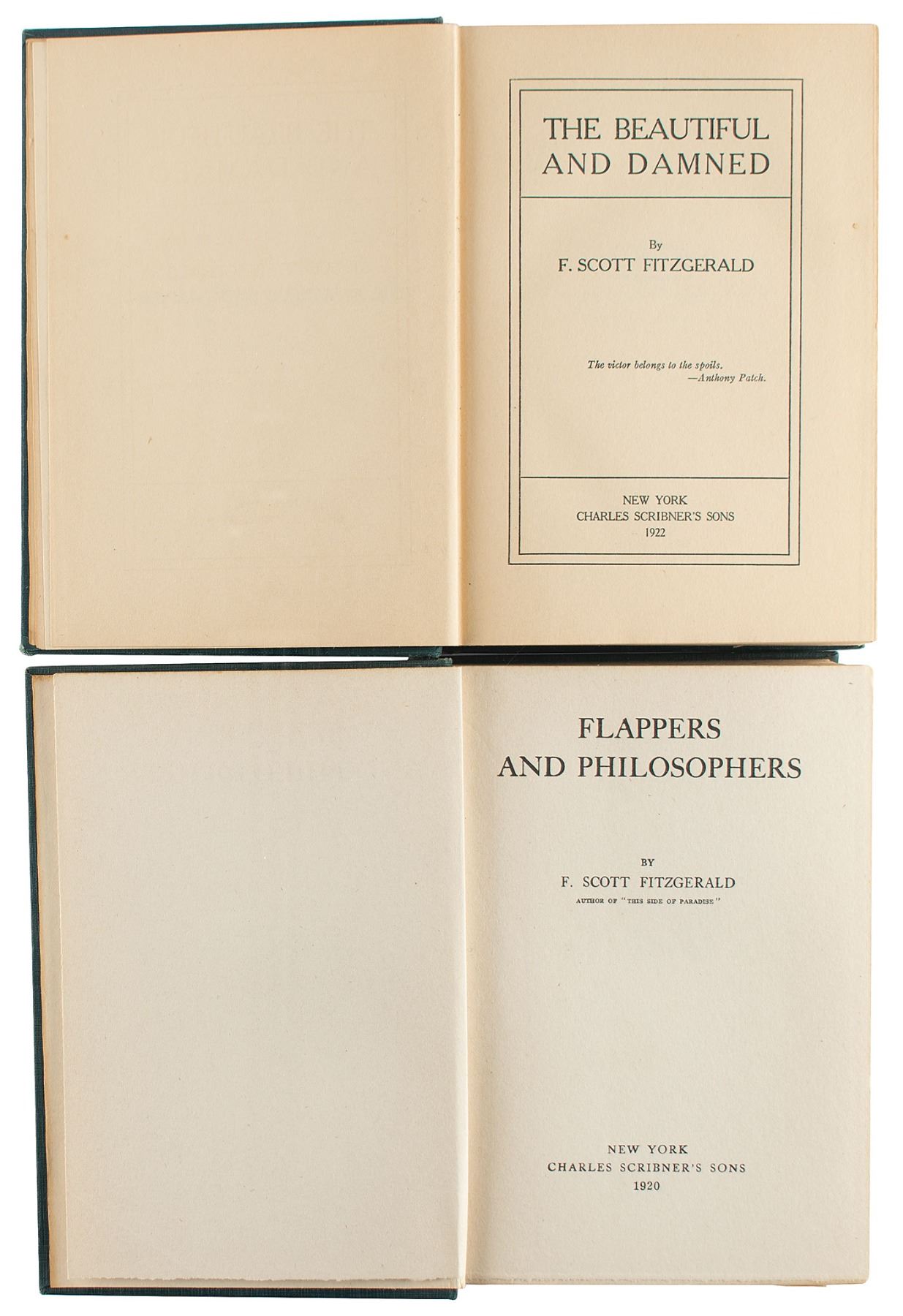 Two unsigned first edition hardcover books by F. Scott Fitzgerald, both lacking dust jackets: Flappers and Philosophers, published by Charles Scribner's Sons in 1920; and The Beautiful and Damned, published by Charles Scribner's Sons in 1922. Book condition: VG/None, with the first free end page missing from Flappers and Philosophers. Only 5,000 copies of Flappers and Philosophers were produced in this first print run, while The Beautiful and Damned had an initial print run of 20,000.