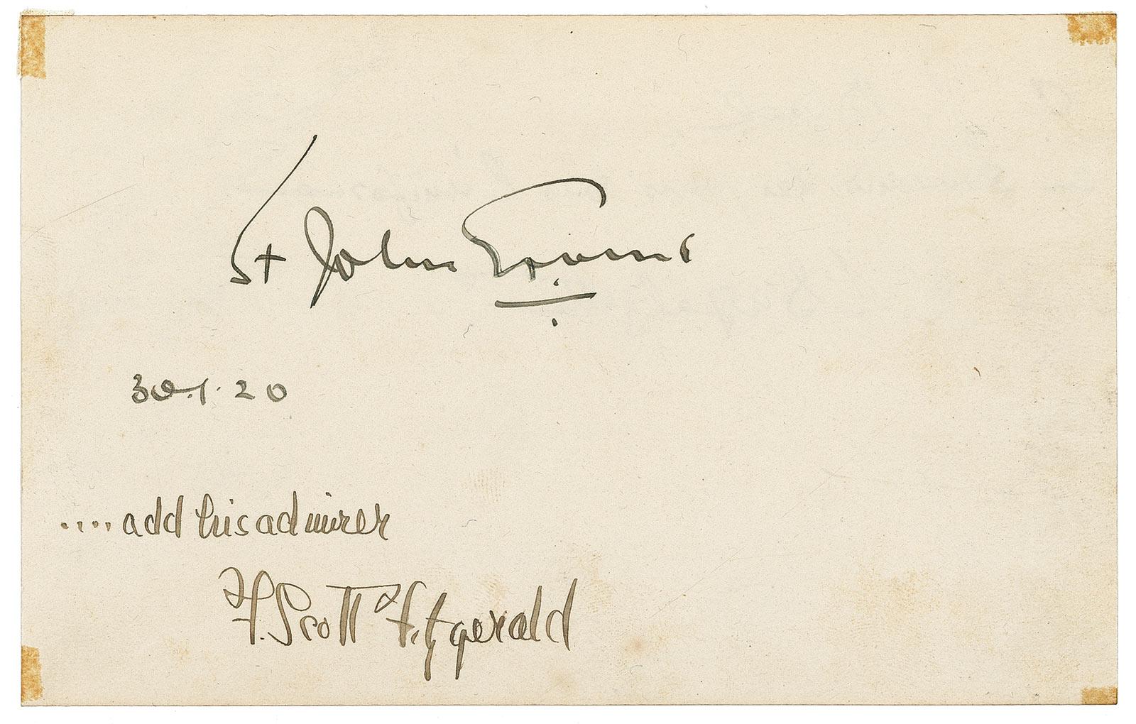 Jazz Age novelist and short story writer. He is regarded as one of the greatest American writers of the twentieth century. Fitzgerald was the self-styled spokesman of the “Lost Generation,” Americans born in the 1890s who came of age during World War I. He finished four novels, left a fifth unfinished, and wrote dozens of short stories that feature themes of youth, despair, and age. Fountain pen signature of Irish author St. John Ervine, and signed underneath, “30.1.20…and his admirer, F. Scott Fitzgerald,” on an off-white 6.25 x 4 album page. In fine condition, with small mounting remnants to each corner tip, and a touch of mild toning. A splendid and unusual example of this desirable literary autograph. Pre-certified John Reznikoff/PSA/DNA and RRAuction COA.