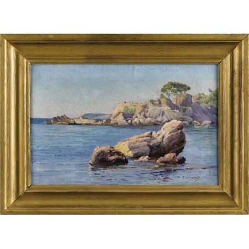 <B>F. TAUFFRETZ </B></I>(European Nineteenth Century)<BR><I>Rocky Shore, Capri</B></I><BR>Oil on canvas<BR>12 x 18-1/4 inches (30.5 x 46.4 cm)<BR>Signed lower right: <I>F. Tauffretz</B></I><BR> <B>Condition Report:</B> Partially wax relined canvas along perimeter; bubbling along top edge of canvas<BR><BR><b>Shipping:</b> Requires 3rd Party Shipping (<a target="_blank" href="http://www.heritageauctions.com/common/shipping.php">view shipping information</a>)