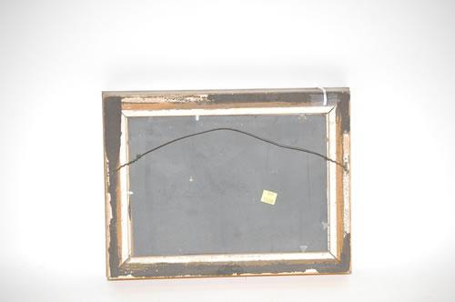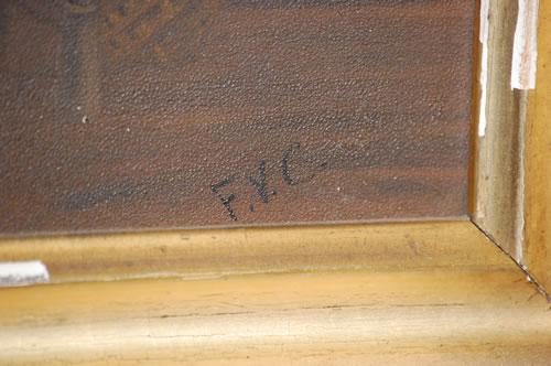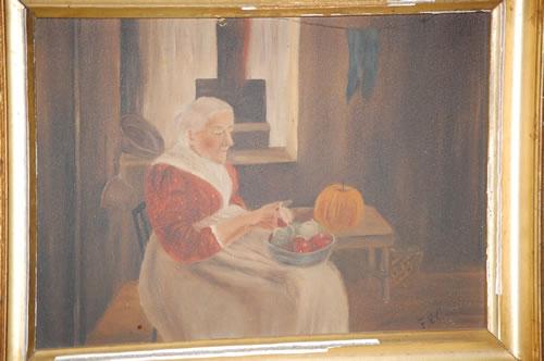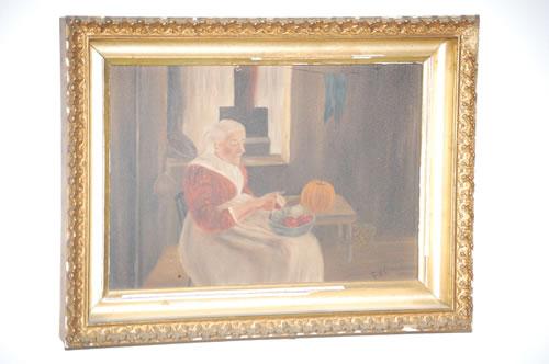 F.V.C. OIL PAINTING ON ARTISTS BOARD PORTRAIT OF AN OLD WOMAN IN A DRESS & APRON SITTING IN A CHAIR PEELING APPLES IN A KITCHEN-SIGNED F.V.C. ON LOWER RIGHT IN A GILT MOLDED FRAME (7 1/4" X 10 1/2")-WEAR, SOILING, FRAME DAMAGE, IMPERFECTIONS