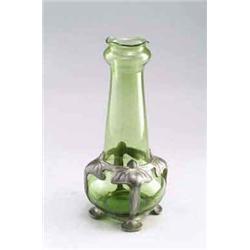 F. VAN HAUTEN SOHN, Bonn Vase, Zinn, grünes Glas. Durchbrochene Zinnmontierung mit stilisiertem Efeudekor und vier ausgezogenen Füßen. Bauchige Form mit langem, leicht zusammen laufendem Hals, nodusartig verdicktem Mündungsbereich und ausgezogenem sowie welligem Mündungsrand. H.: 28 cm. Bez.: Firmen- und Stadtmarke, Mod.Nr. 1670. Um 1900