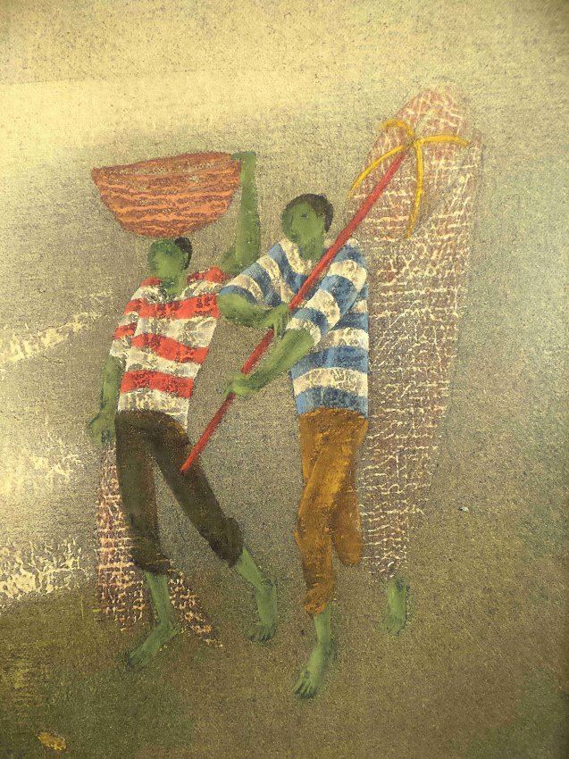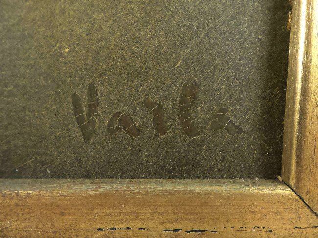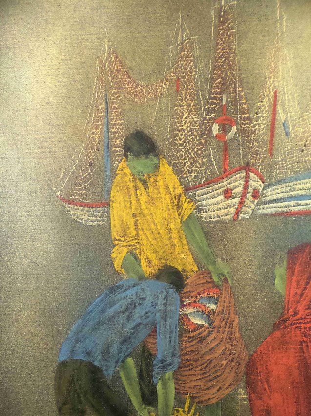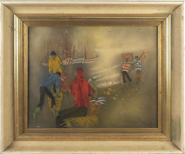 Felix Varla. Modern oil on canvas depicting fishermen with nets and baskets and boats in the background. Signed lower right, "Varla". [Sight: 14 5/8" x 17 3/4"; Frame: 22" x 25 1/4"]. Verso bears Nassau Art Gallery label; Nassau, Bahamas. Soiling, minor scuff at lower left.