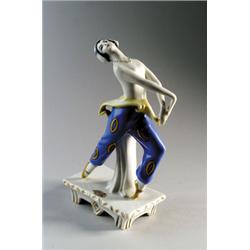 Porzellan. Farbige Bemalung, goldstaffiert. Tänzerin in Schrittstellung. H.: 20,5 cm. Bez.: Firmenmarke (aufglasurgrün und Blindstempel), Zusatz EE 547. Dep. (Blindstempel), Malernr. ligiertes HA (schwarz gemalt), Bossierernr. 61, Firmenklebeetikett. Nach 1935