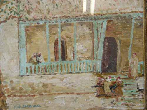 F.W. Jackson - 'Maison a Tunis' - oil on board; and another - cattle in a rural landscape, 31cms x 41cms (Maison) 21.5cms x 38.5cms (cattle) £100-150