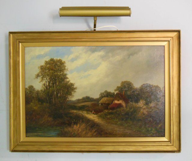 Depicting "House by Stream". Image approx. 20" x 30". Frame approx. 25.5" x 36".