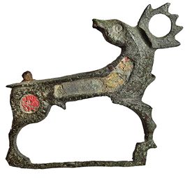 Fíbula en forma de cérvido. Siglos III-IV a.C. Bronce. Posee incrustaciones de pasta vítrea. Longitud 4,0 cm.