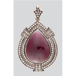 20. sz. utolsó harmada, 18 k arany, fémjel nélkül, 1 db nagy cseppalakú cabouchon csiszolású almandinnal és 135 db briliánnsal, cca 2,50 ct, ACrVsSi, 14,2 g