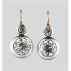 Pest, 20. sz. eleje, 14 k arany és ezüst, boutone foglalásban 2 db briliáns cca 2 ct, R1TCrVsSi és 2 db briliáns cca 0,20 ct, R2TCrSi, hagyományos patent zárral, 3,9 g
