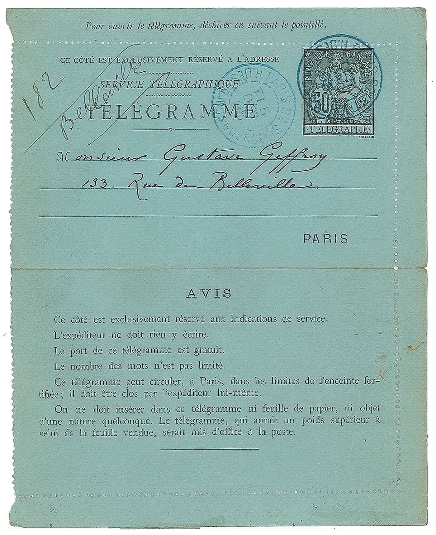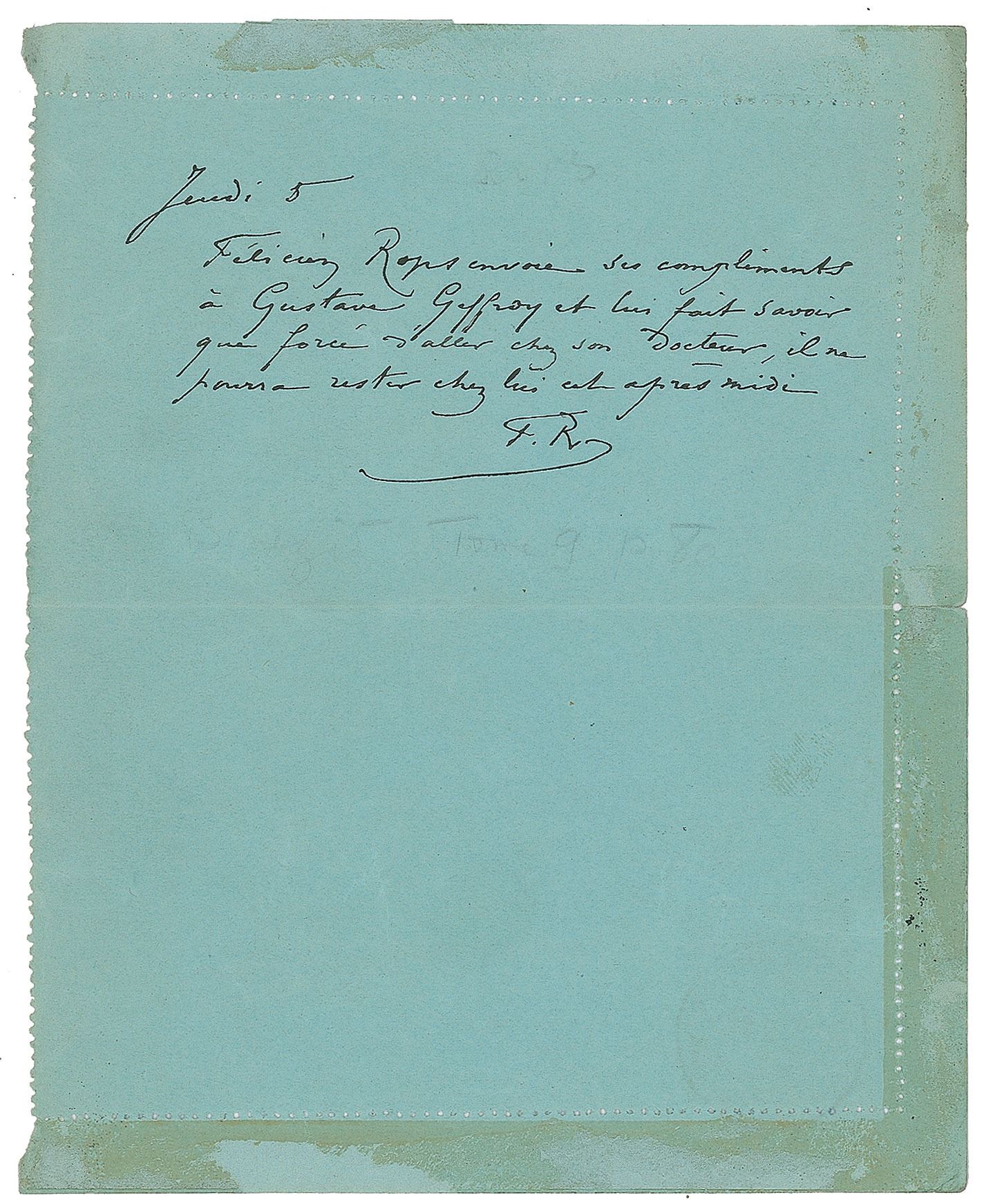 Belgian artist (1833–1898) known primarily as a printmaker in etching and aquatint. ALS in French, signed “F. R.,” one page, 4.75 x 6, postmarked December 1895. Letter to influential art critic and author Gustave Geffroy, in part (translated): "Felicien Rops sends his compliments to Gustave Geffroy and lets him know that, forced to go to his doctor, he will not be able to stay at home this afternoon.” In fine condition, with adhesive residue to the perimeter. Accompanied by a printed obituary notice.