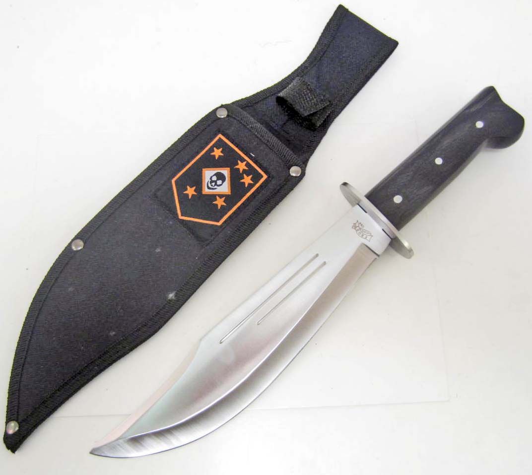 13 7/8" overall. 8 7/8" stainless bowie blade. Black pakkawood handle. Black nylon belt sheath.