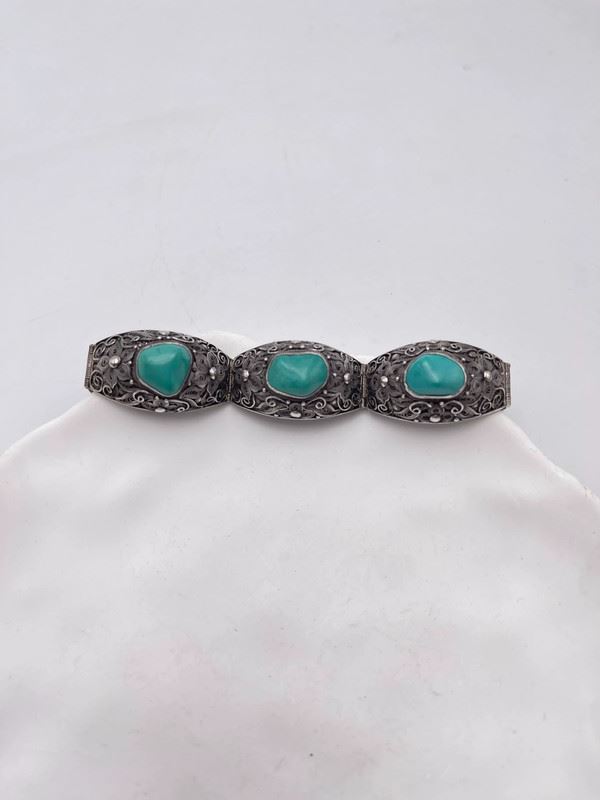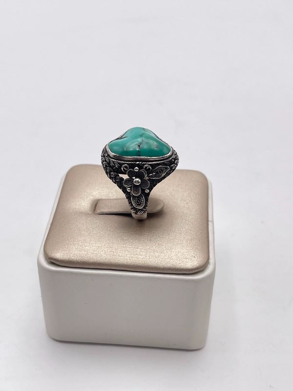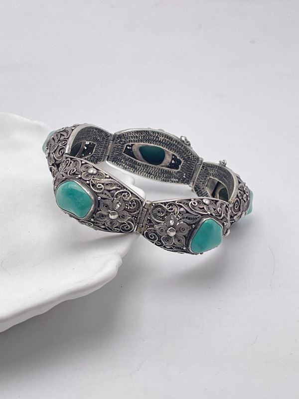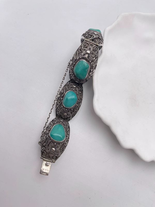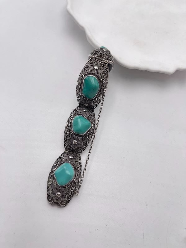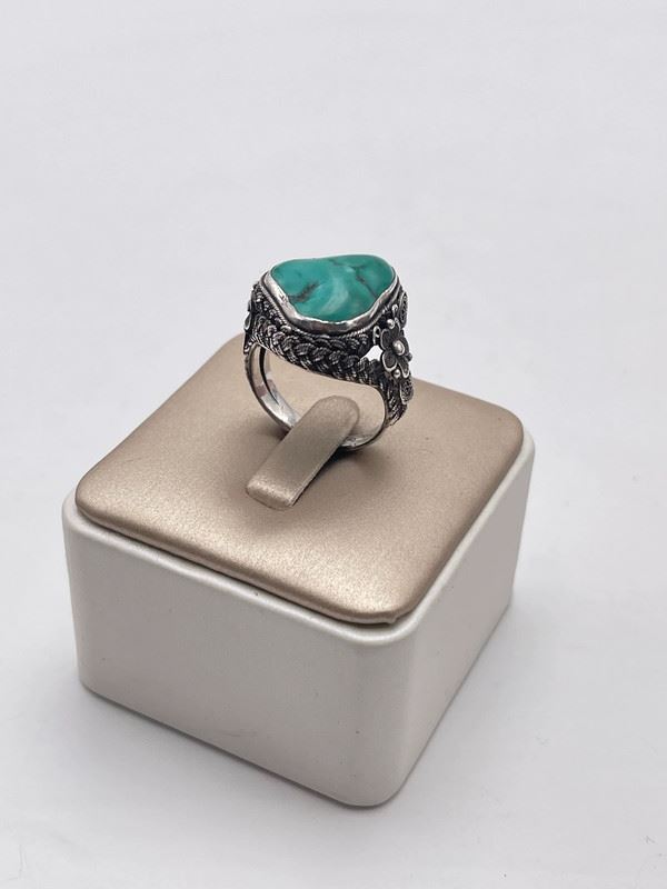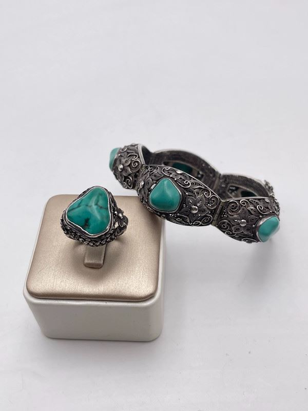This F92 export premium silver filigree inlaid natural turquoise ring and bracelet set features exquisite silver filigree craftsmanship, showcasing a unique artistic design and noble elegance. Both the ring and bracelet are set with vibrant natural turquoise, reflecting the gift of nature. The intricate silver filigree work adds a delicate touch and depth to the piece. Whether for daily wear or special occasions, this set will enhance your elegance and carries significant collectible value.