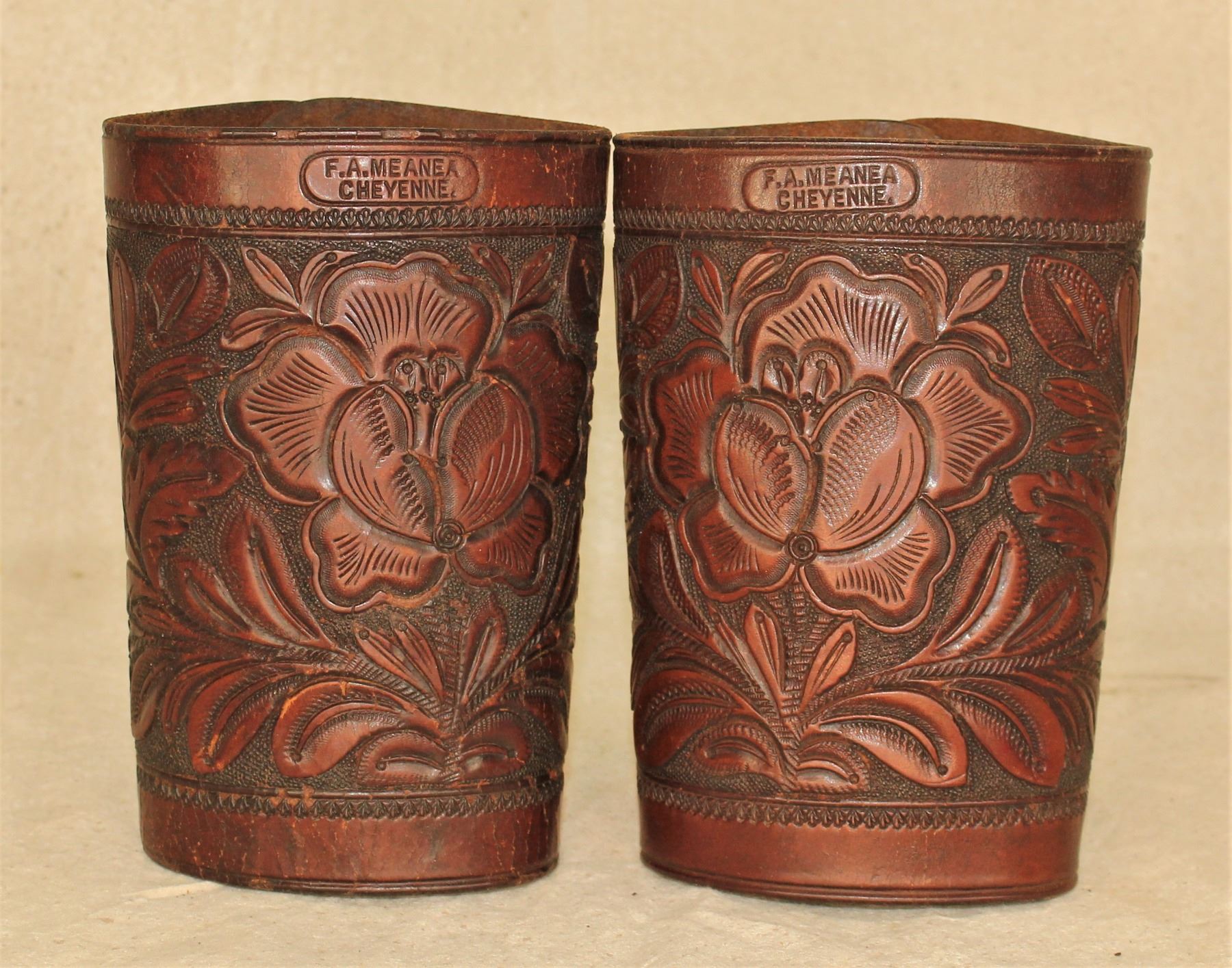Fabulous uncommon fully flower tooled cuffs with stunning deep tooling, color and condition. Roger Wilmot Collection