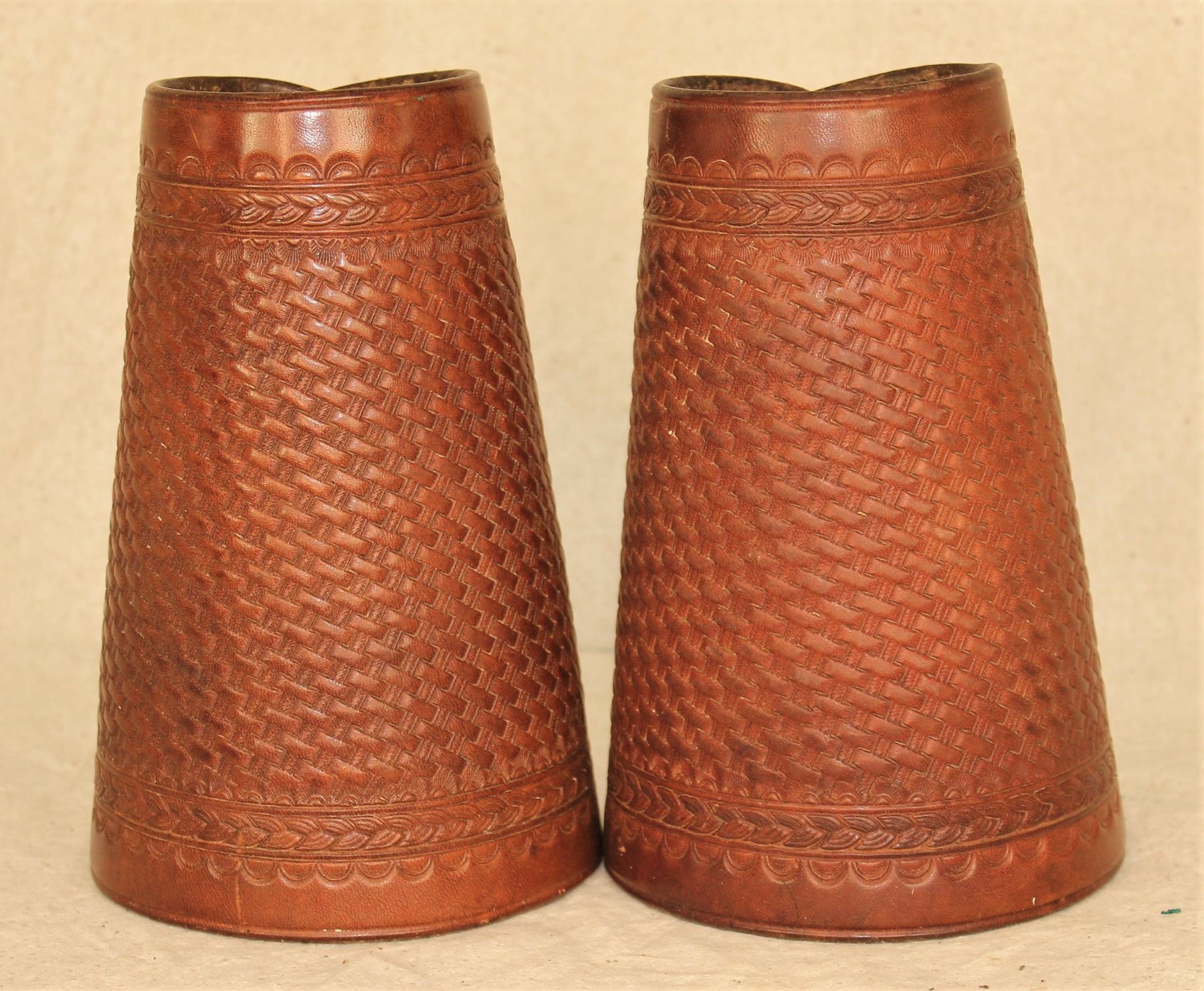 Exceptional light colored pair of large fully basket stamped cuffs with great maker's marks, in near mint condition. Roger Wilmot Collection