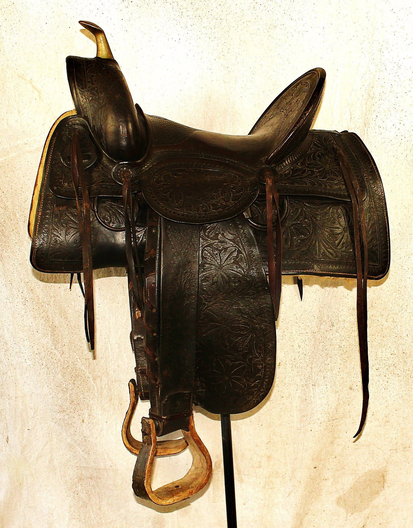 A highly desirable Wyoming Territory marked 14X, full flowered tooled 16" saddle with oversized square skirts, 6" cantle, and nickel horn.