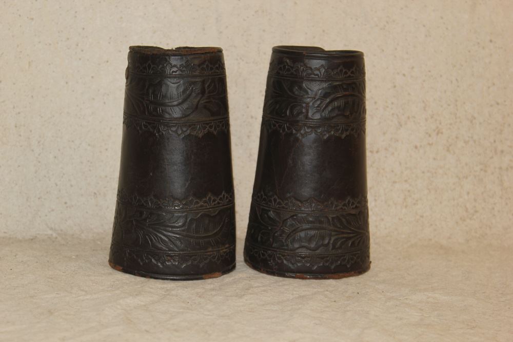 Exceedingly rare full flower tooled cowgirl size wrist cuffs with deep color and patina, with a great makers mark.