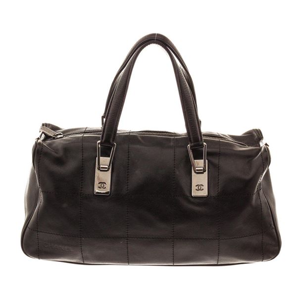 Chanel Black Leather Chocolate Bar Shoulder Bag with material leather, silver-tone hardware, interior slip pocket, shoulder strap and zipper closure.