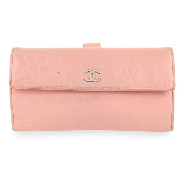 Chanel Camellia Leather Wallet Fold over and pull snap closure Silver-tone hardware Pink leather with Camellia embossed details 7 Interior credit card