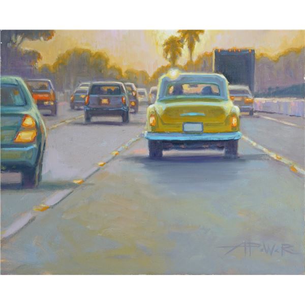 The golden glow of sunset illuminates travelers driving a classic Chevy into the horizon in this 16x20 oil on canvas panel by Anette Power. with artis